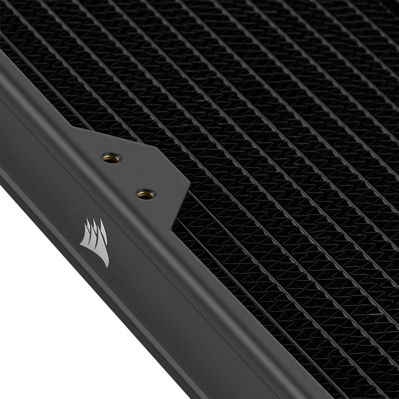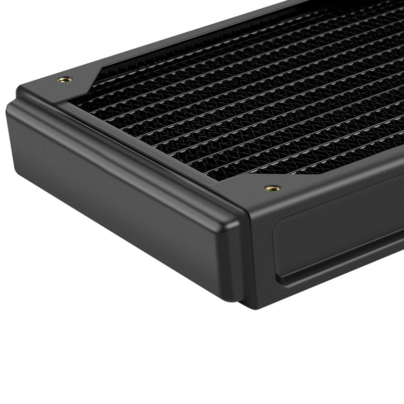 Der Radiator besteht aus hochwertigem Kupfer und Messing, was eine herausragende Wärmeleitfähigkeit garantiert. Mit einer Dicke von 30 Millimetern und 14 FPI (Fin per Inch) bietet er eine effiziente Kühlung, selbst unter extremen Bedingungen. Der Corsair Hydro X Series XR5 240 NEO ist so konzipiert, dass er bis zu vier 120-mm-Lüfter in einer Push/Pull-Konfiguration unterstützen kann, wodurch die Kühlleistung noch weiter optimiert wird.