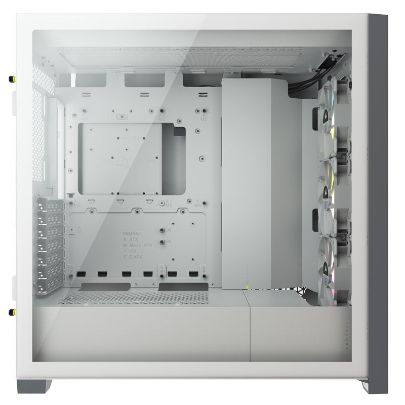 Geräumiger Midi-Tower in Weiß, für Mainboards bis E-ATX (277 mm), Seitenteil aus Tempered Glass, 3x 120 mm RGB-Lüfter in der Front, PWM-Lüfter-Hub und Lighting Node CORE, Radiatoren bis 360 mm, Grafikkarten bis 420 mm Länge, vertikale Erweiterungsslots
