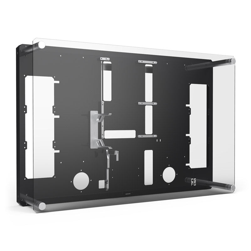 Wandmontierbares Showcase-Gehäuse, ATX-Formfaktor, konzipiert für Custom-Wasserkühlungen, vertikale GPU-Montage, zwei große Ausgleichsbehälter, Dual-Loop-Kühlungen möglich, Radiatoren bis 360 mm, Grafikkarten bis 400 mm Länge