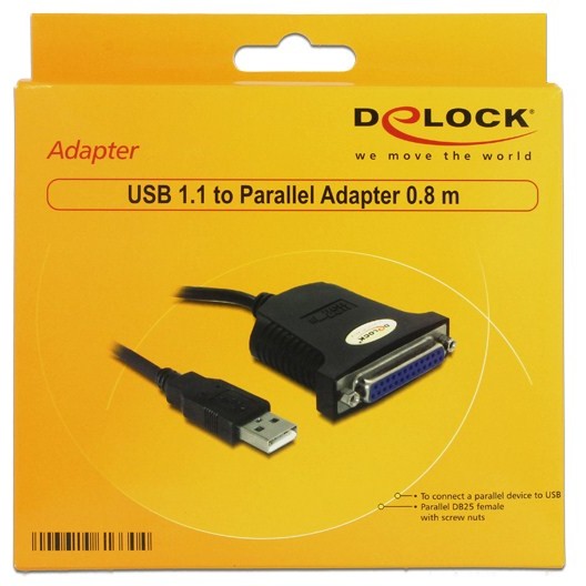 DeLOCK USB 1.1 parallel adapter. Anschluss 1: USB A. Anschluss 2: DB25. Kabellänge: 0.8 m