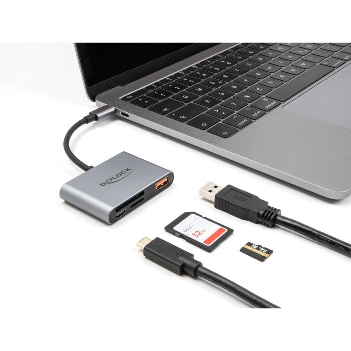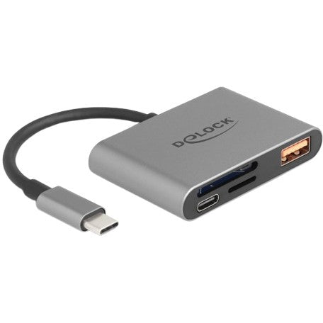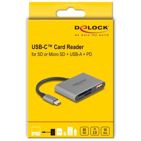 DELOCK USB-C Card Reader fur SD und Micro SD Speicherkarten + USB 10 Gbps Typ-A Port und USB Type-C PD 2.0 85 W