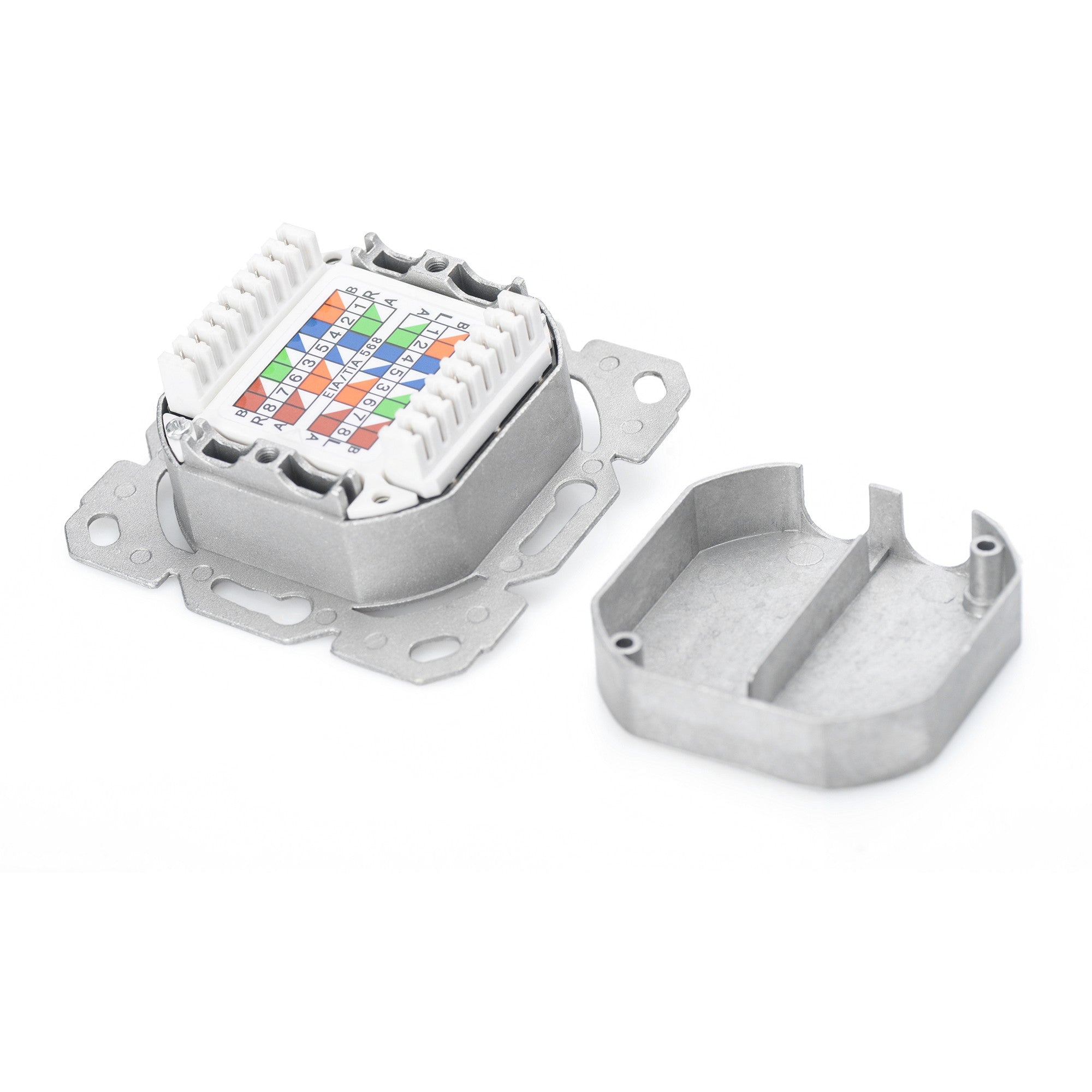Digitus CAT 6A Klasse EA Netzwerkdose. designkompatibel. geschirmt. Unterputz. Buchsen-Typ: 2 x RJ-45. Anzahl Module (max.): 1 Modul(e). Netzwerk-Kabel Kategorie: 6a. Produktfarbe: Weiß. Gehäusematerial: Metall. Breite: 80 mm. Tiefe: 38.5 mm. Höhe: 80 mm. Ursprungsland: China