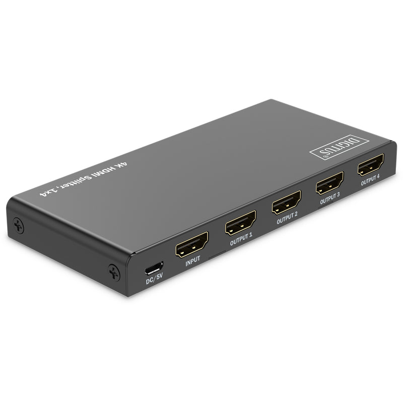 Digitus 4K HDMI Splitter. 1x4. Video Porttyp: HDMI. Teilnehmerausgang: 4x HDMI. Stecker: Micro USB. Maximale Auflösung: 3840 x 2160 Pixel. Produktfarbe: Schwarz. Gehäusematerial: Metall. Stromverbrauch (Standardbetrieb): 5 W. Breite: 61 mm. Tiefe: 136 mm. Höhe: 14 mm. Menge pro Packung: 1 Stück(e). Verpackungsbreite: 123 mm. Verpackungstiefe: 179 mm