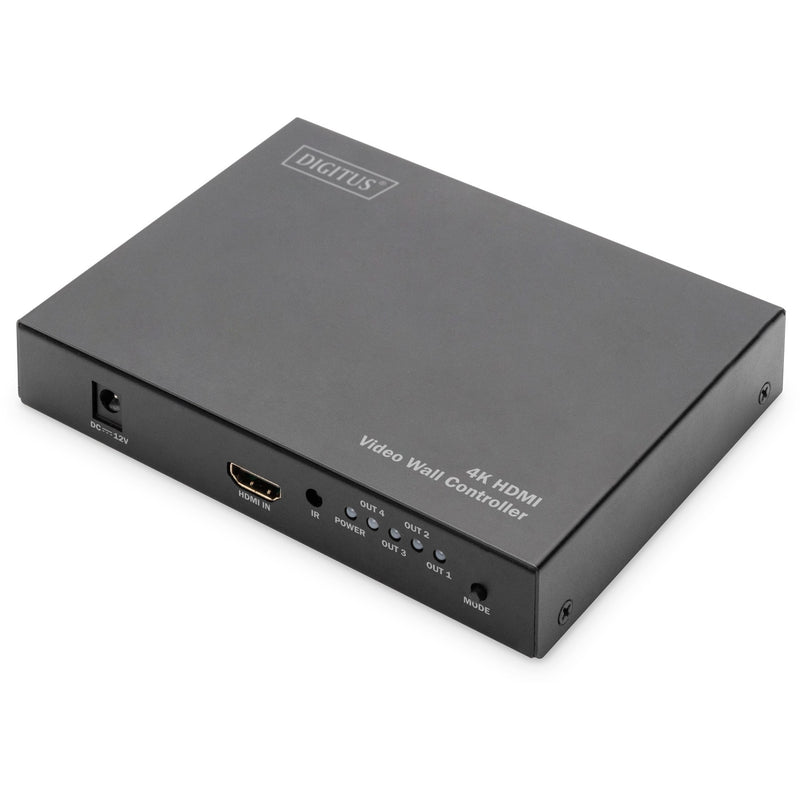 Digitus 4K HDMI Videowand-Prozessor. 2x2. Produktfarbe: Schwarz. Gehäusematerial: Metall. Unterstützte Video-Modi: 480i. 480p. 576i. 576p. 720p. 1080i. 1080p. Eingangsspannung: 12 V. Ursprungsland: China. Breite: 115 mm. Tiefe: 111 mm. Höhe: 27 mm