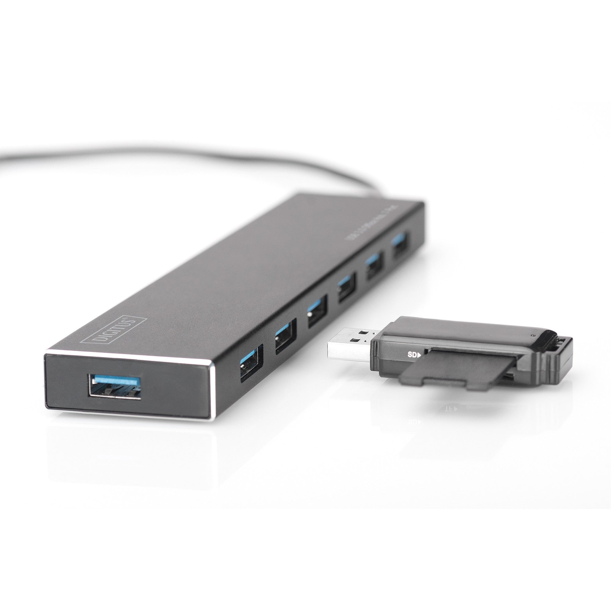 Digitus USB 3.0 Office Hub. 7-Port. Hostschnittstelle: USB 3.2 Gen 1 (3.1 Gen 1) Type-A. Hub-Schnittstellen: USB 3.2 Gen 1 (3.1 Gen 1) Type-A. Datenübertragungsrate: 5000 Mbit/s. Produktfarbe: Grau. Gehäusematerial: Aluminium. Energiequelle: USB. Eingangsspannung: 5 V. Eingangsstrom: 3.5 A. Unterstützt Windows-Betriebssysteme: Windows 10. Windows 7. Windows 8. Windows 8.1. Windows Vista. Windows XP Home. Unterstützt Mac-Betriebssysteme: Mac OS 9.1. Mac OS 9.2. Mac OS X 10.0 Cheetah. Mac OS X 10.1 Puma. Mac OS X 10.10 Yosemite. Mac OS.... Breite: 42.3 mm. Tiefe: 144 mm. Höhe: 14.3 mm