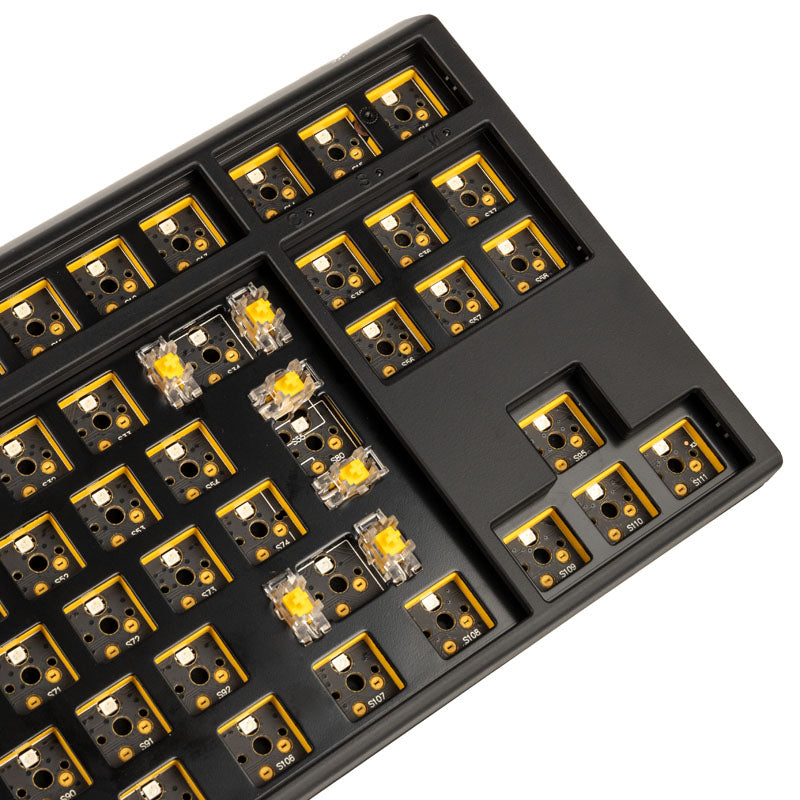 Schwarze Gaming-Tastatur im TKL-Format (80 %), ISO-Tastenlayout, Hot-Swap-fähig, mit RGB-Beleuchtung, ohne Switches und Keycaps