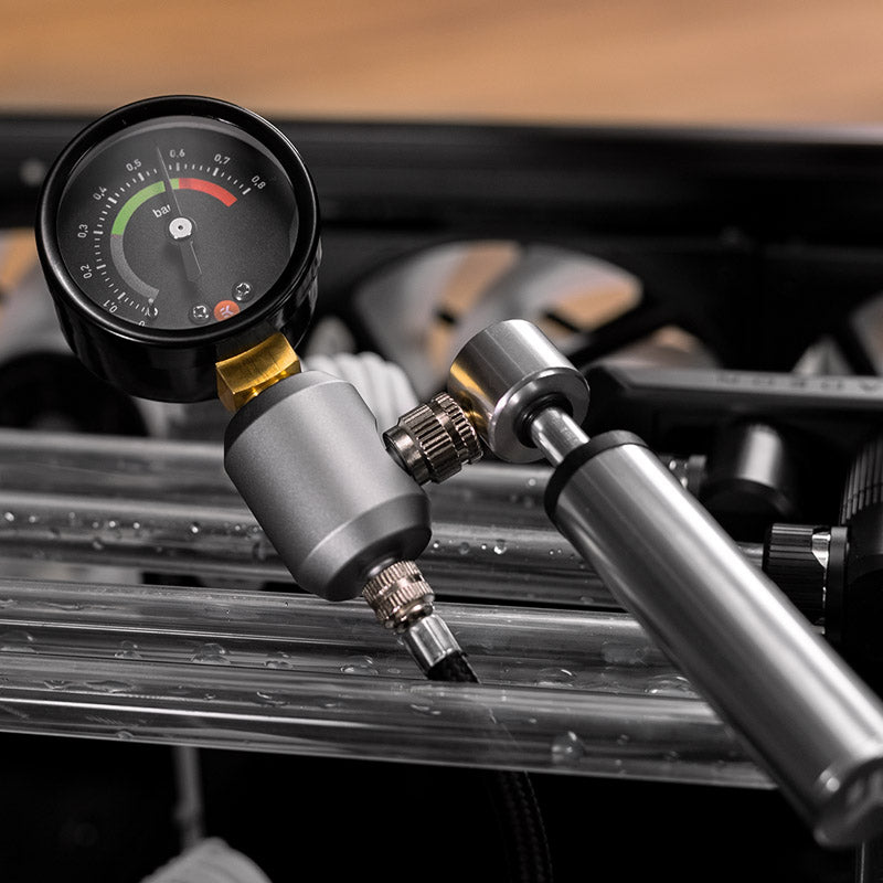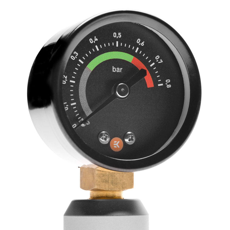 Mit einem integrierten Druckanzeige bietet der EK-Loop Leak Tester Flex klare und deutliche Informationen über den Druck in Ihrem System. So können Sie sicherstellen, dass alles ordnungsgemäß funktioniert, bevor Sie mit dem eigentlichen Betrieb beginnen. Das Gerät wird mit einer leistungsstarken Pumpe geliefert, die eine einfache Handhabung ermöglicht und sicherstellt, dass der Druck überall im Kühlsystem gleichmäßig verteilt wird.