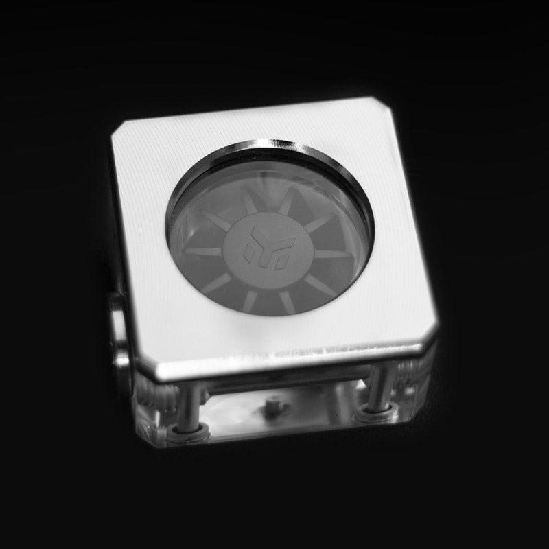 Hergestellt aus hochwertigem transparentem Acrylglas, ermöglicht er eine klare Sicht auf den Wasserfluss und sorgt somit für eine optimale Überwachung Ihrer Kühlleistung. Das silberne Cover aus vernickeltem Aluminium ergänzt das Design perfekt und betont die edlen Materialien.