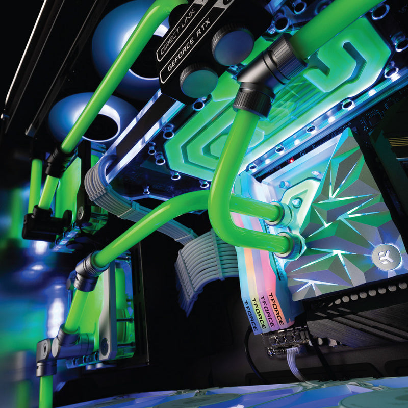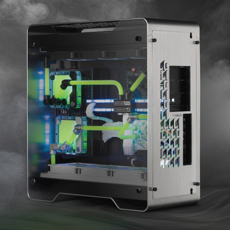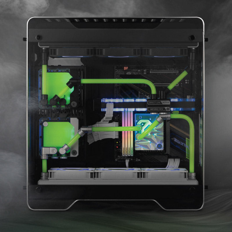 Das EK-Quantum InWin 977EK ist nicht nur visuell ansprechend, sondern bietet auch Platz für bis zu zwei 420 mm Radiatoren, wodurch eine ausgezeichnete Kühlung für Ihre leistungsstarken Komponenten sichergestellt ist. Die speziellen Halterungen für Pumpen und andere essentielle Hardware erleichtern den Aufbau und die Anpassung Ihres Systems.