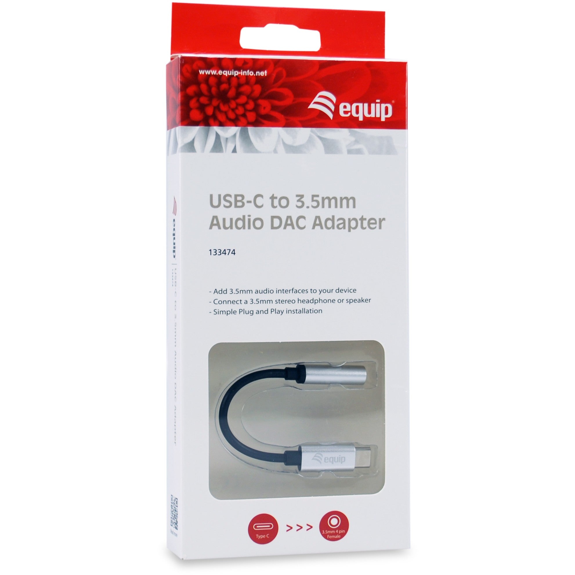 Equip USB-C 3.5mm Kopfhörer DAC Adapter. Produktfarbe: Schwarz. Silber. Anschluss 1: USB-C. Anschluss 2: 3.5 mm. Verpackungsart: Box. Verpackungsbreite: 90 mm. Verpackungstiefe: 25 mm. Ursprungsland: China. Breite des Versandkartons: 390 mm. Länge des Versandkartons: 280 mm