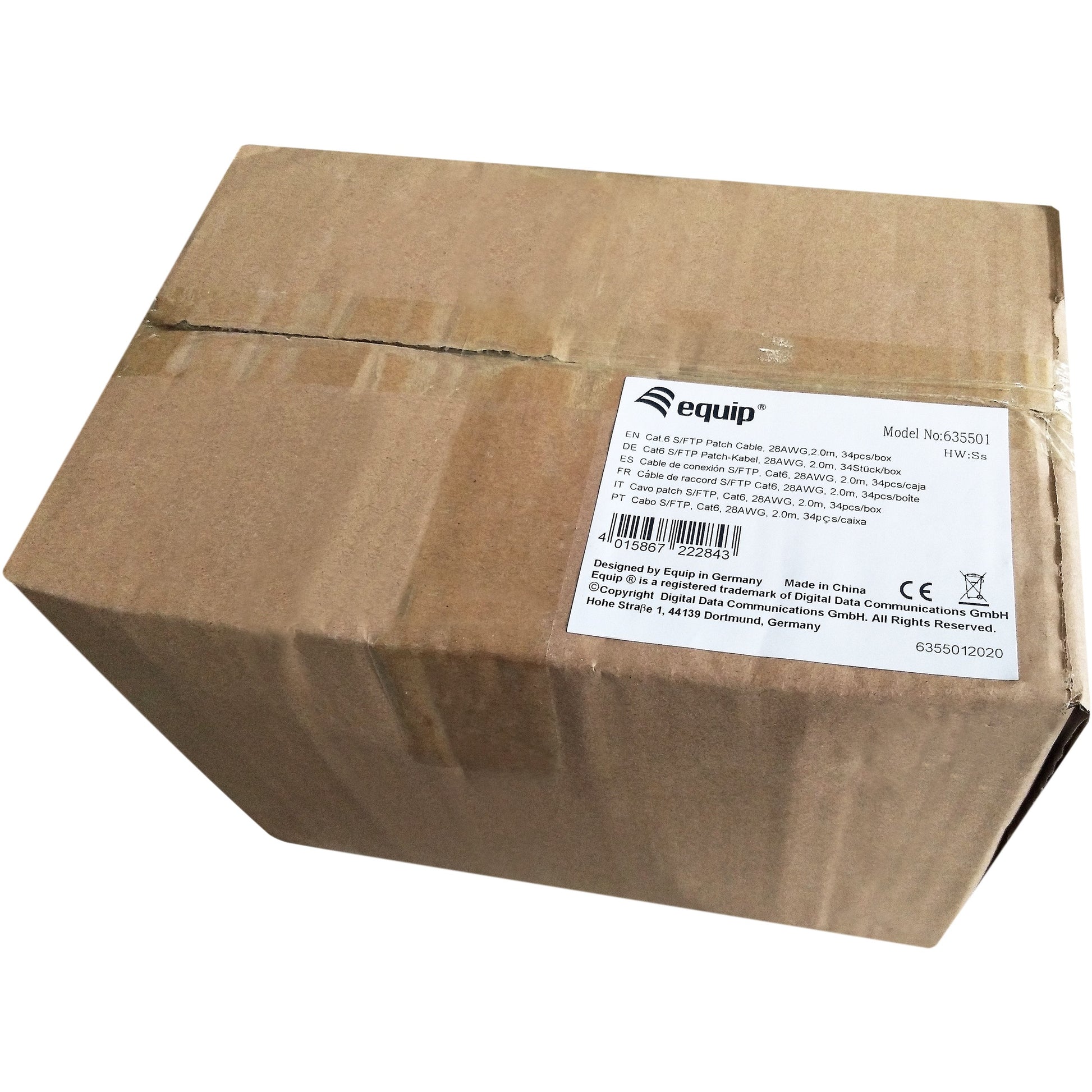 Equip Cat.6 S/FTP Patchkabel. 2.0M. Grau. 34Stück/set. Kabellänge: 2 m. Kabelstandard: Cat6. Kabelschirmung: S/FTP (S-STP). Anschluss 1: RJ-45. Anschluss 2: RJ-45. Beschichtung Steckerkontakte: Gold. Datenübertragungsrate: 1000 Mbit/s. Produktfarbe: Grau