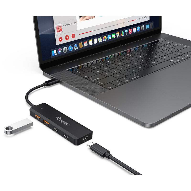 Equip USB-C 4-Port USB 3.2 Gen 2 (10Gbps) Hub. USB-C x 2. USB-A x 2. Hostschnittstelle: USB 3.2 Gen 2 (3.1 Gen 2) Type-C. Hub-Schnittstellen: USB 3.2 Gen 2 (3.1 Gen 2) Type-C. USB 3.2 Gen 2 (3.1 Gen 2) Type-A. Datenübertragungsrate: 10000 Mbit/s. Produktfarbe: Schwarz. Kabellänge: 0.18 m. Netzteiltyp: USB. Eingangsspannung: 5 V. Eingangsstrom: 2 A. Unterstützt Windows-Betriebssysteme: Windows 10. Windows 10 Education. Windows 10 Education x64. Windows 10 Enterprise. Windows 10.... Unterstützt Mac-Betriebssysteme: Mac OS X 10.10 Yosemite. Mac OS X 10.11 El Capitan. Mac OS X 10.12 Sierra. Mac OS X 10.13 High.... Unterstützung anderer Betriebsysteme: ChromeOS. Breite: 30 mm. Tiefe: 12.5 mm. Höhe: 102 mm