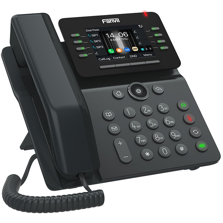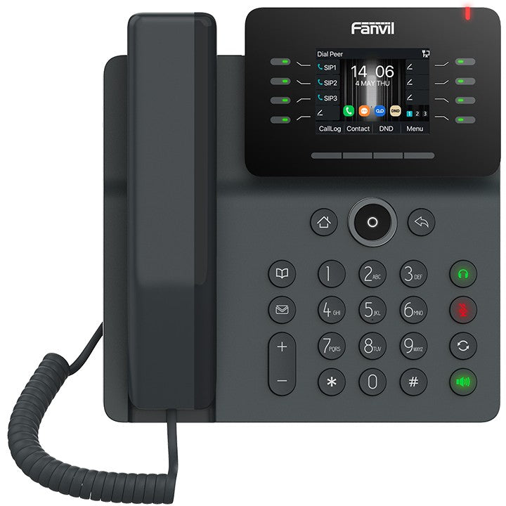 Fanvil V63. Produkttyp: IP-Telefon. Produktfarbe: Schwarz. Hörertyp: Kabelgebundenes Mobilteil. Linienanzahl: 6 Zeilen. Telefonbuch Kapazität: 1000 Eintragungen. Display: LCD. Bildschirmdiagonale: 7.11 cm (2.8"). Display-Auflösung: 320 x 240 Pixel. Mikrofon-Frequenz: 0 - 70 Hz. Sprachcodec: AGC. G.711a. G.711u. G.722. G.723.1. G.726. G.729. G.729A. G.729B. G.729ab. PLC. VAD. iLBC. Schnittstellentyp Ethernet-LAN: Gigabit Ethernet. Ethernet LAN Datentransferraten: 10.100.1000 Mbit/s. WLAN-Standards: 802.11a. 802.11b. 802.11g. Wi-Fi 4 (802.11n). Wi-Fi 5 (802.11ac)