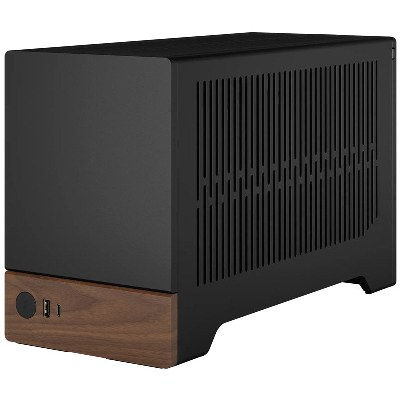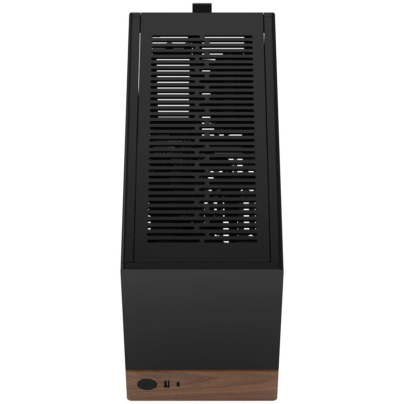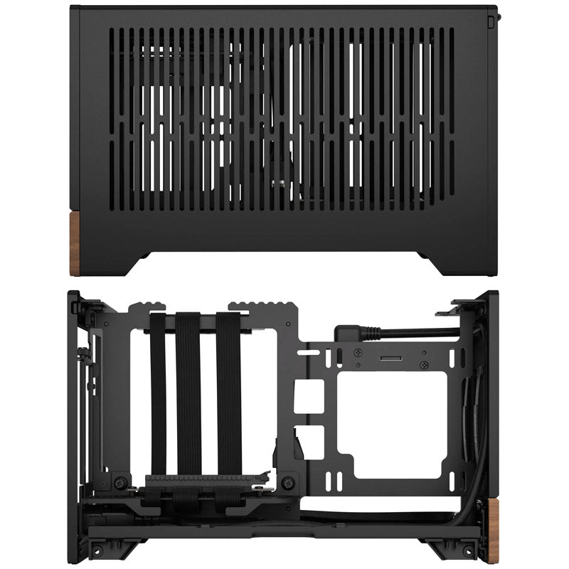 Kompakter Mini-ITX-Tower aus Aluminium, mit elegantem Walnussholz-Frontpanel, 2x 2,5 Zoll SSDs möglich, für GPUs bis 322 mm Länge, CPU-Kühler bis 77 mm Höhe, inklusive PCIe-4.0-Riser-Kabel