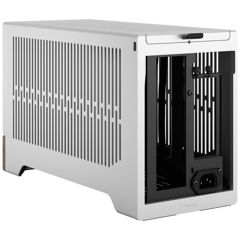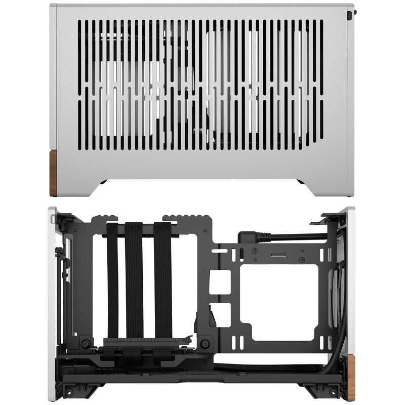 Kompakter Mini-ITX-Tower aus Aluminium, mit elegantem Walnussholz-Frontpanel, 2x 2,5 Zoll SSDs möglich, für GPUs bis 322 mm Länge, CPU-Kühler bis 77 mm Höhe, inklusive PCIe-4.0-Riser-Kabel