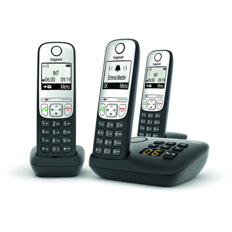 Gigaset A690A Trio. Typ: Analoges/DECT-Telefon. Hörertyp: Kabelloses Mobilteil. Freisprecheinrichtung. Telefonbuch Kapazität: 100 Eintragungen. Anrufer-Identifikation. Bildschirmdiagonale: 5.08 cm (2"). Produktfarbe: Schwarz. Anzahl enthaltener Handsets: 3