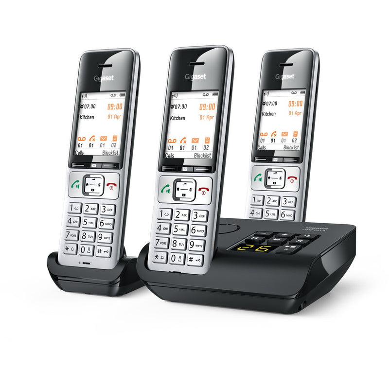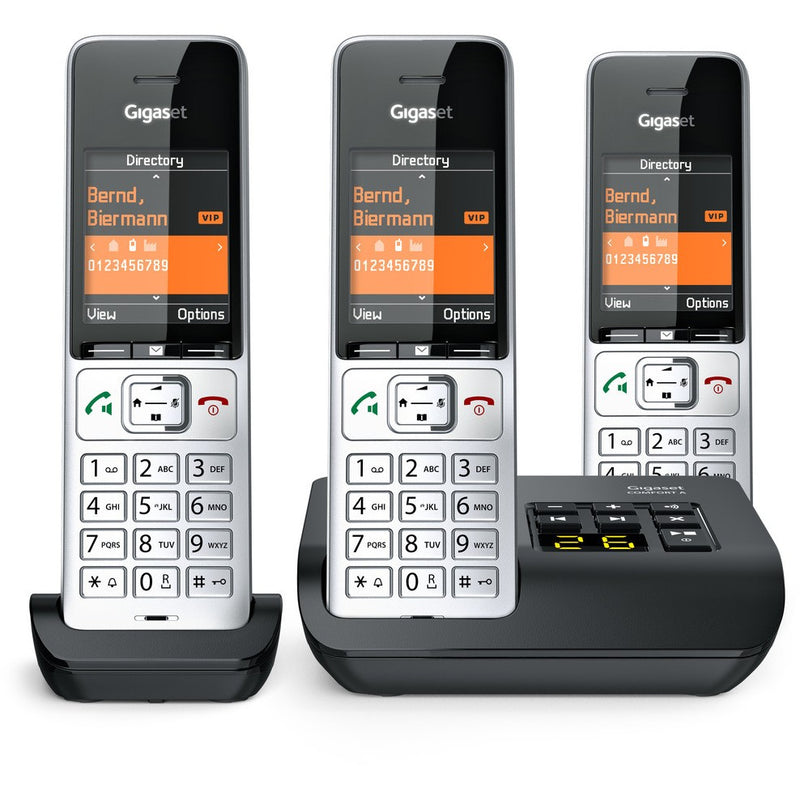 Gigaset COMFORT 500A Trio. Typ: Analoges/DECT-Telefon. Hörertyp: Kabelgebundenes Mobilteil. Freisprecheinrichtung. Telefonbuch Kapazität: 200 Eintragungen. Anrufer-Identifikation. Bildschirmdiagonale: 5.59 cm (2.2"). SMS (Kurznachrichtendienst). Produktfarbe: Schwarz. Silber. Anzahl enthaltener Handsets: 3