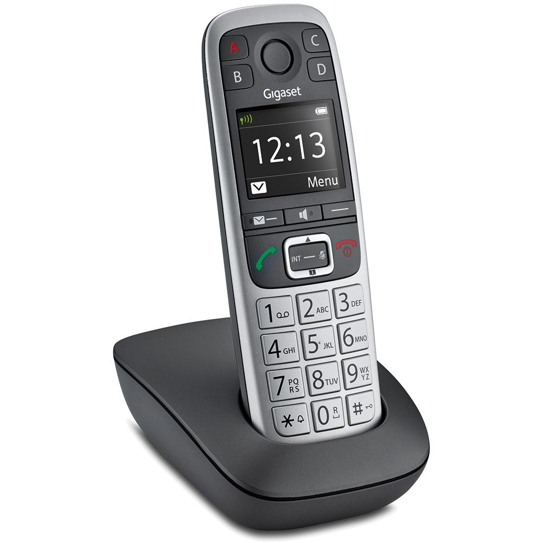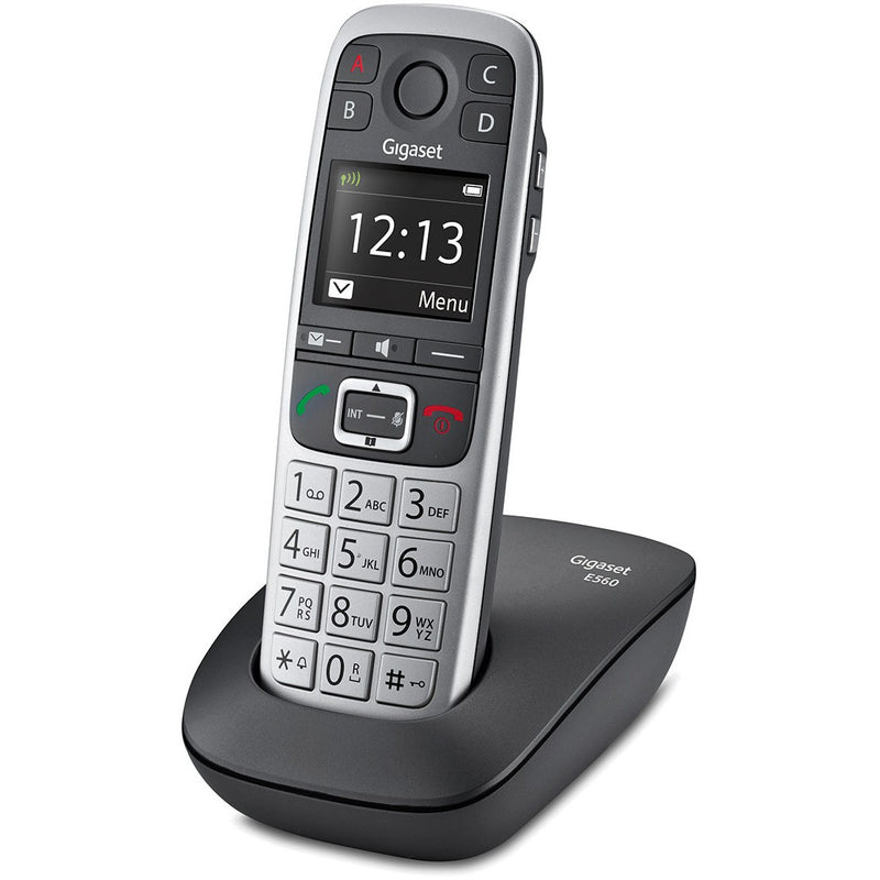 Gigaset E560. Typ: Analoges/DECT-Telefon. Hörertyp: Kabelloses Mobilteil. Telefonbuch Kapazität: 150 Eintragungen. Bildschirmdiagonale: 4.57 cm (1.8"). Produktfarbe: Schwarz. Silber. Anzahl enthaltener Handsets: 1