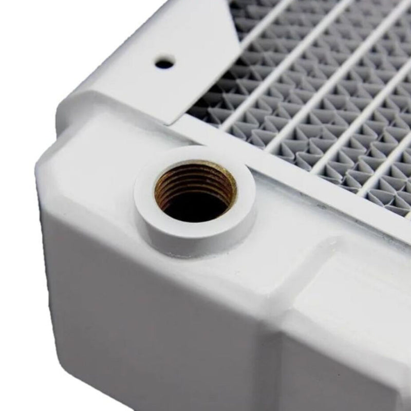 Das satin-weiße Design verleiht Ihrem Setup nicht nur einen eleganten Look, sondern fügt sich auch nahtlos in verschiedene Builds ein. Die feinen Kühllamellen und die durchdachte Bauweise maximieren den Luftstrom und reduzieren den Widerstand, was zu einer hohen Wärmeableitungsrate führt. Egal, ob Sie ein Gaming-System oder einen leistungsstarken Arbeits-PC zusammenstellen, dieser Radiator sorgt dafür, dass alles kühl bleibt – selbst bei den anspruchsvollsten Anwendungen.