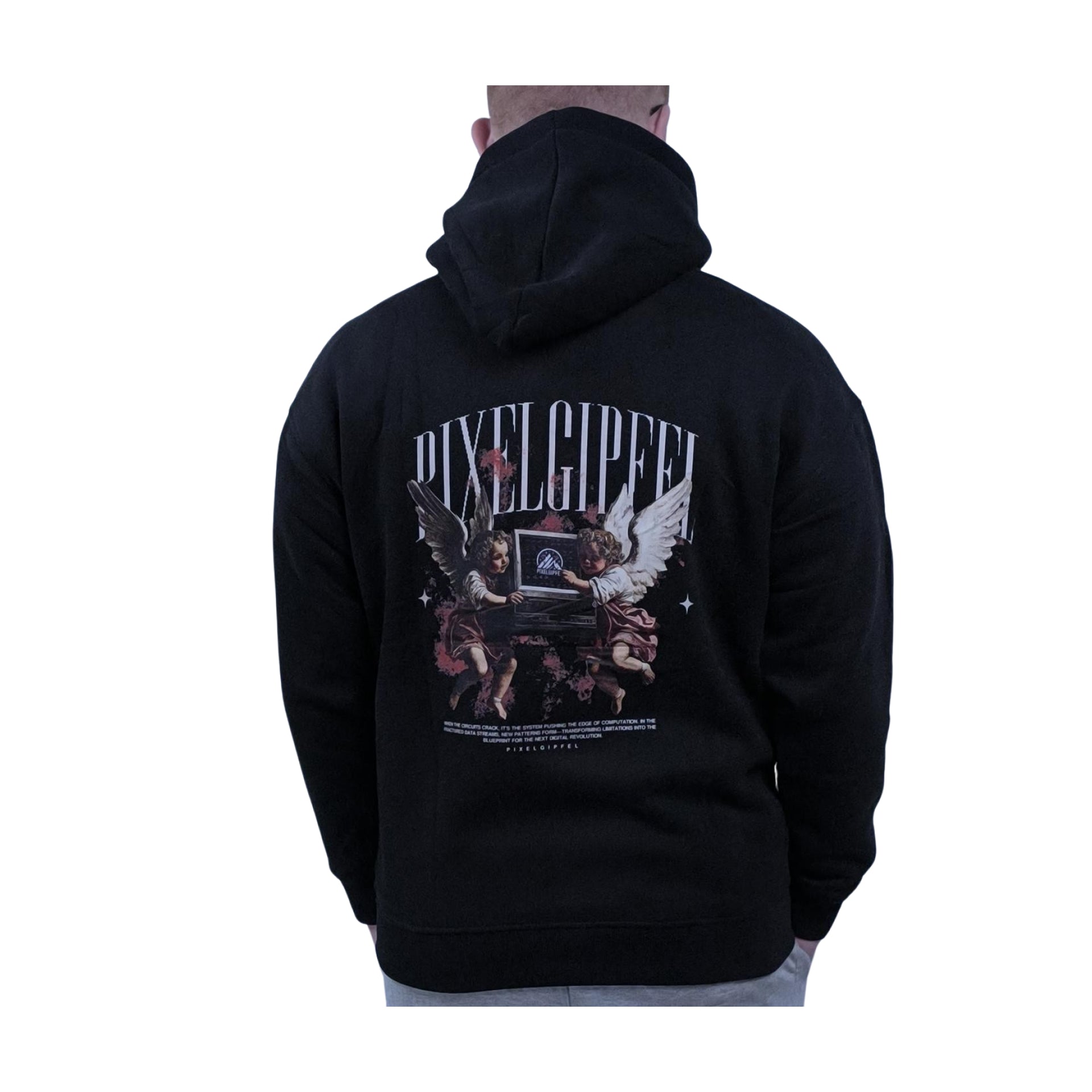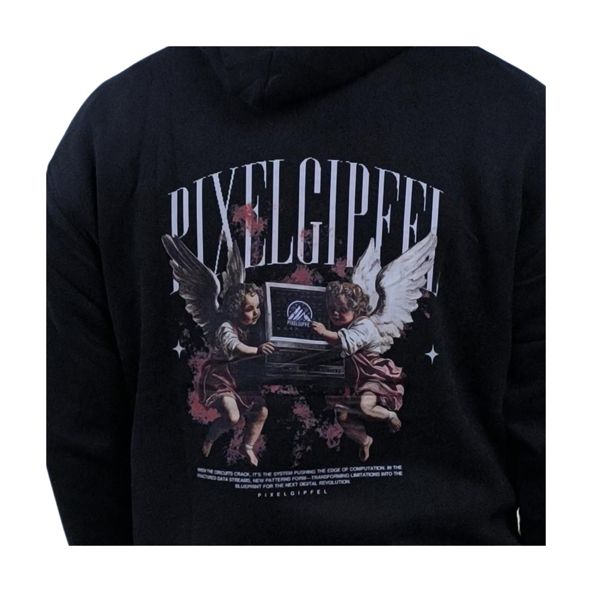 Auffälliges Design: Engel-Motiv kombiniert mit dem Pixelgipfel-Schriftzug – ein Kunstwerk zum Tragen.