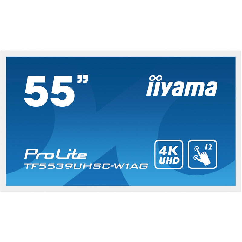 iiyama ProLite 55" (139 cm) Multi-Touch-Display mit IPS Panel. Touch-durch-Glas Technologie und Anti-Glare Beschichtung. Bildschirmdiagonale: 139.7 cm (55"). Display-Auflösung: 3840 x 2160 Pixel. HD-Typ: 4K Ultra HD. Bildschirmtechnologie: LED. Reaktionszeit: 8 ms. Natives Seitenverhältnis: 16:9. Bildwinkel. horizontal: 178°. Bildwinkel. vertikal: 178°. Eingebaute Lautsprecher. VESA-Halterung. Produktfarbe: Weiß