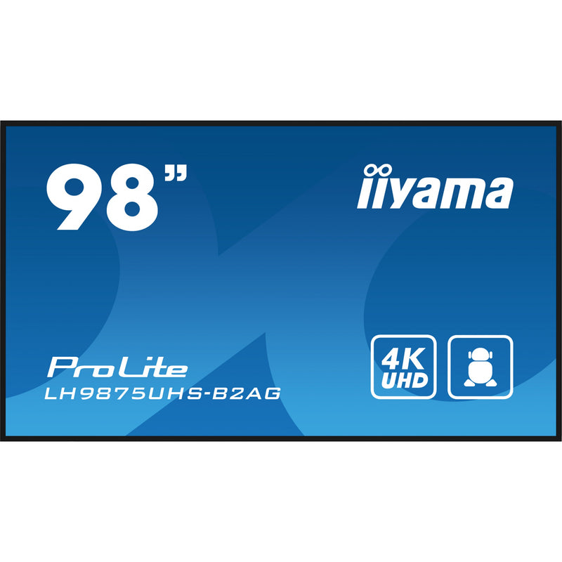 iiyama Ein 97.5" (247.7 cm) professionelles Digital Signage Display mit 4K UHD-Auflösung. Android OS. iiSignage² und OPS PC-Steckplatz. Produktdesign: Digital Signage Flachbildschirm. Bildschirmdiagonale: 2.48 m (97.5"). Bildschirmtechnologie: LED. Display-Auflösung: 3840 x 2160 Pixel. Helligkeit: 500 cd/m². HD-Typ: 4K Ultra HD. WLAN. Betriebszeiten (Stunden/Tage): 24/7. Installiertes Betriebssystem: Android 11. Produktfarbe: Schwarz
