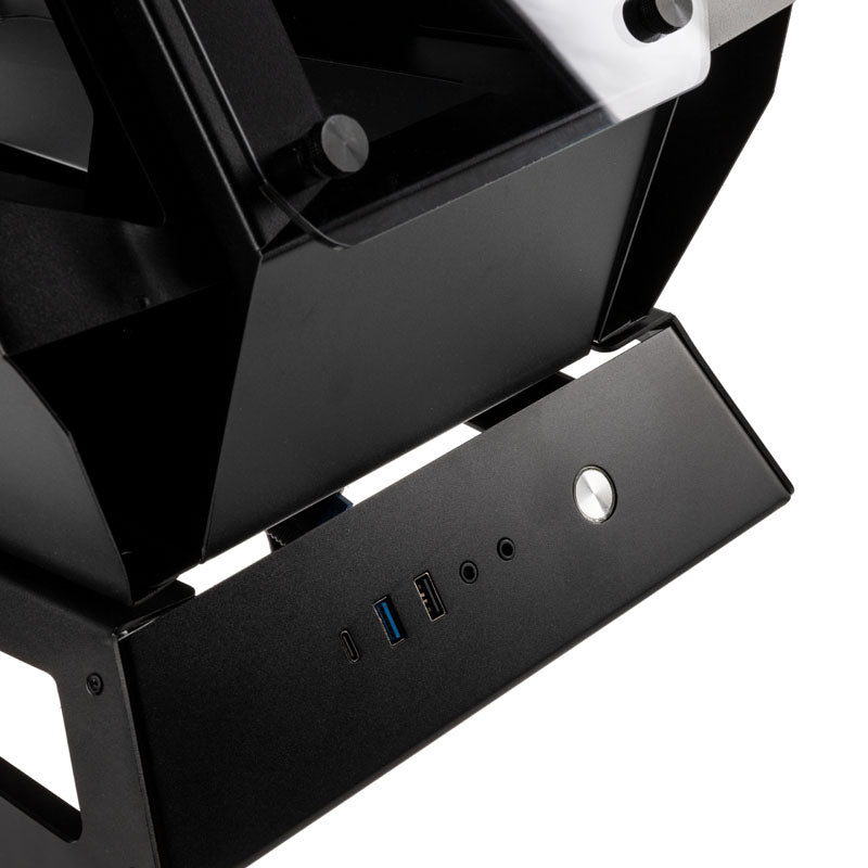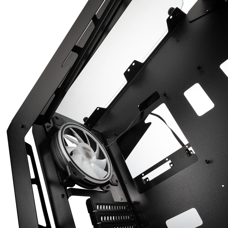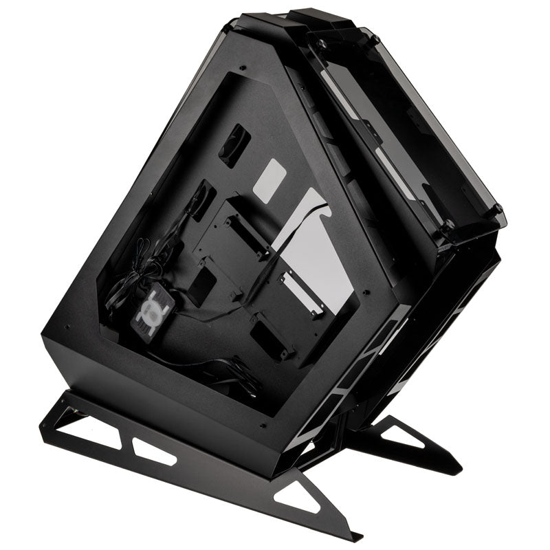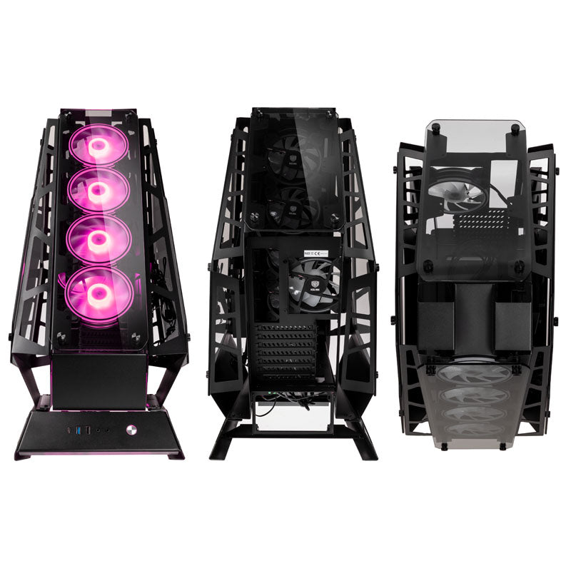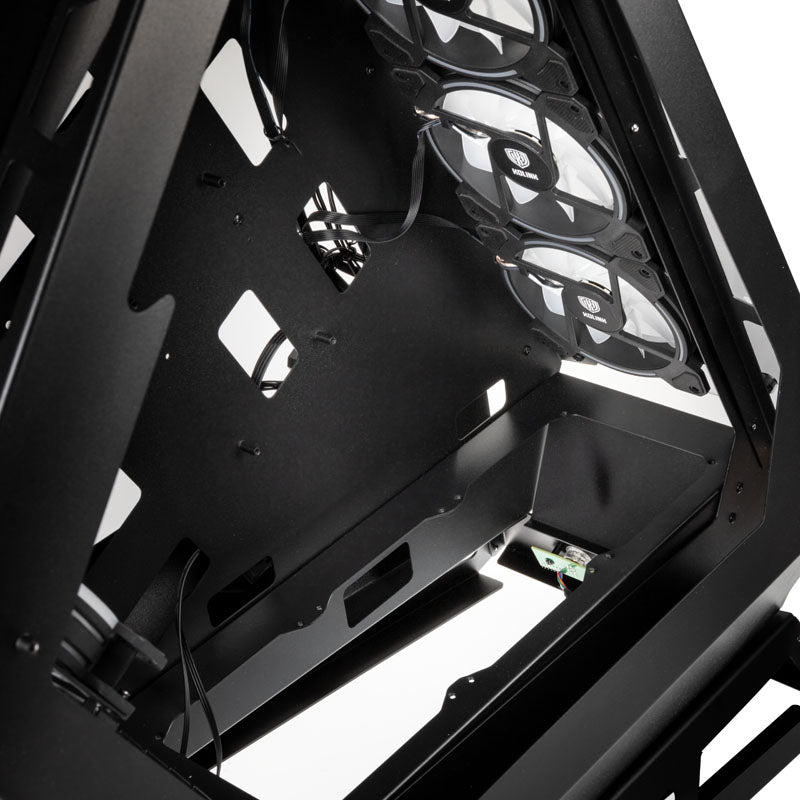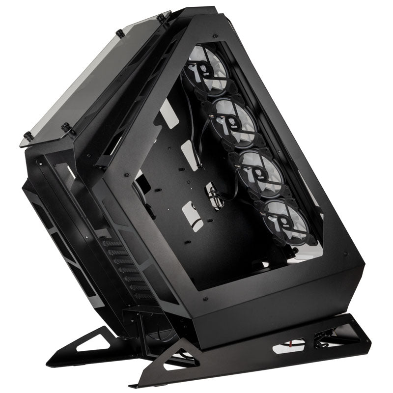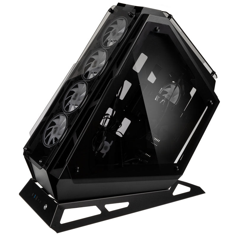 Extravagantes Showcase-Gehäuse von Kolink, Front + Deckel + Seitenteile aus Temperglas, Rahmen aus Stahl und Sockel aus Aluminium, 5x vorinstallierte 120-mm-PWM-Lüfter mit RGB-LEDs, 2x 360er- & 1x 240er-Radiatoren, zwei RGB-LED-Strips an der Vorderseite