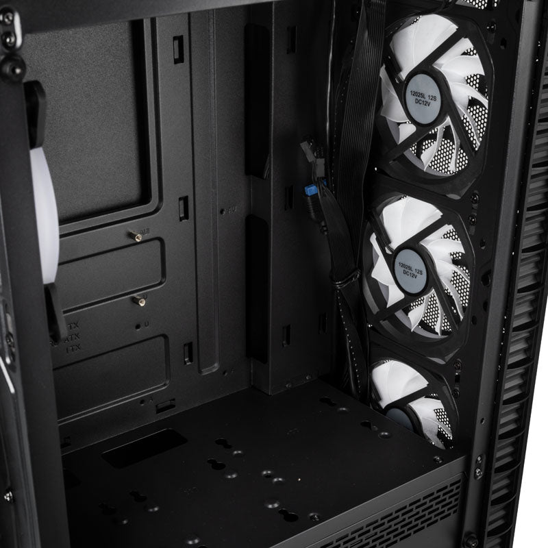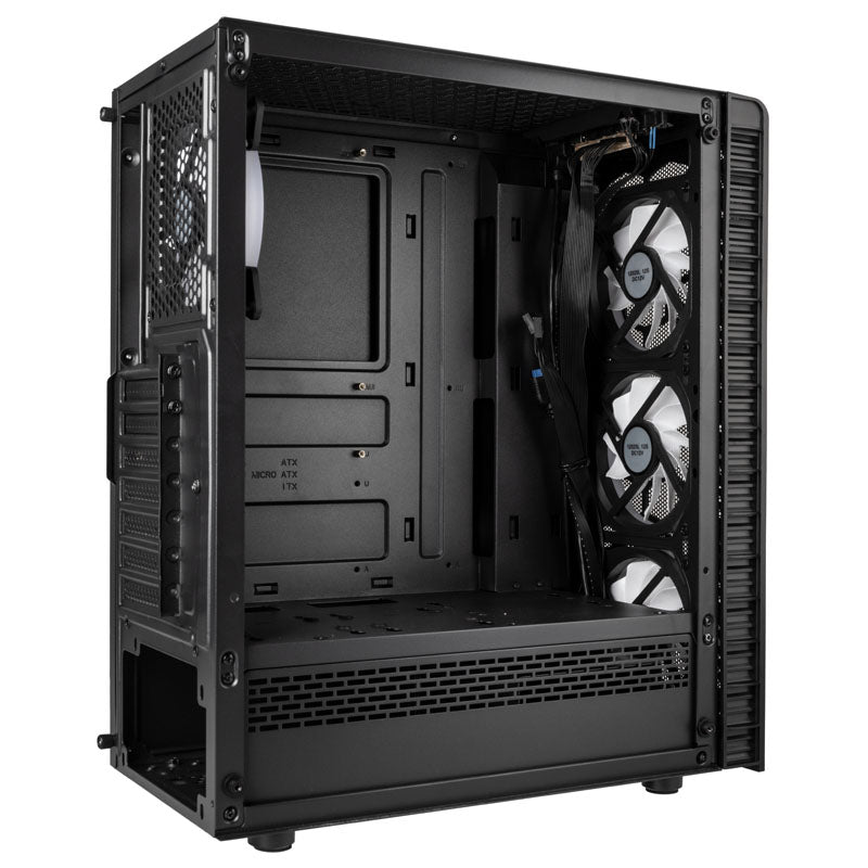 Stylischer Midi-Tower für Mainboards bis ATX, Front mit großflächigem Mesh, Seitenteil aus Tempered Glass, 4x 120mm ARGB-Lüfter vorinstalliert, Radiator bis 280 mm an der Front, 2x 2,5/3,5"- & 2x 2,5"-Slots, entnehmbare Staubfilter