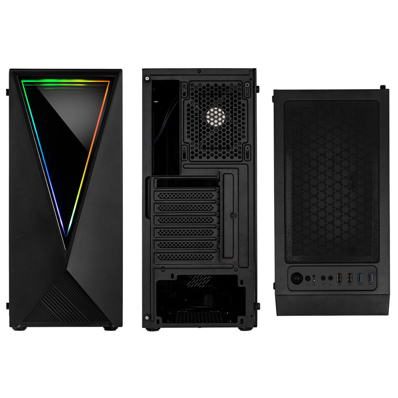 Stylischer Midi-Tower für Mainboards bis ATX, aparte Vorderseite mit Unendlichkeitsspiegeleffekt und RGB-Beleuchtung, 1x 120mm digital adressierbarer RGB-LED-Lüfter vorinstalliert, Radiatoren bis 240 mm, 2x 3,5/2,5"- & 2x 2,5"-Slots, entnehmbare Staubfilter an Deckel und Boden