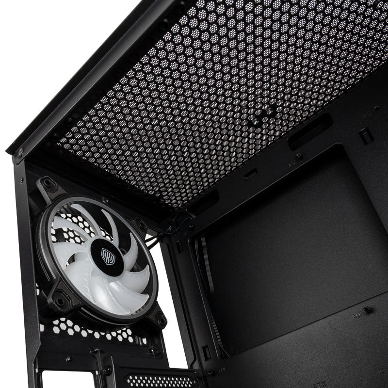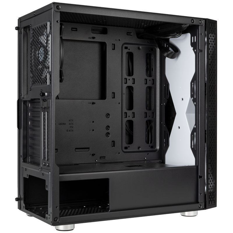 Stylischer Midi-Tower für Mainboards bis ATX, aparte Vorderseite mit Unendlichkeitsspiegeleffekt und RGB-Beleuchtung, 1x 120mm digital adressierbarer RGB-LED-Lüfter vorinstalliert, Radiatoren bis 240 mm, 2x 3,5/2,5"- & 2x 2,5"-Slots, entnehmbare Staubfilter an Deckel und Boden
