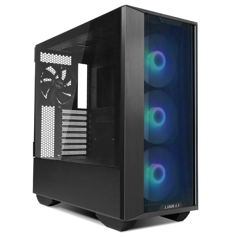 Edler Midi-Tower von Lian Li in Schwarz, für Mainboards bis E-ATX-Formfaktor, Front mit Mesh und digitaler RGB-LED-Beleuchtung, Seitenteile aus Tempered Glass, vier 140-mm-PWM-Lüfter vorinstalliert, 1x 420er / 3x 360er Radiator möglich