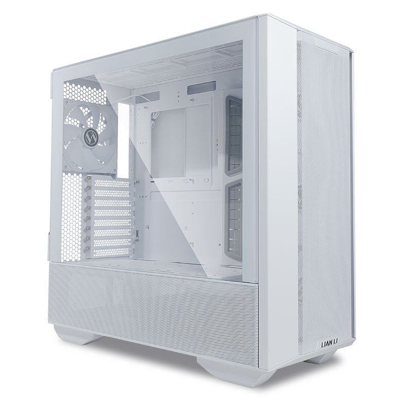 Edler Midi-Tower von Lian Li in Weiß, für Mainboards bis E-ATX-Formfaktor, Front mit Mesh für optimalen Airflow, Seitenteile aus Tempered Glass, vier 140-mm-PWM-Lüfter vorinstalliert, 1x 420er / 3x 360er Radiator möglich