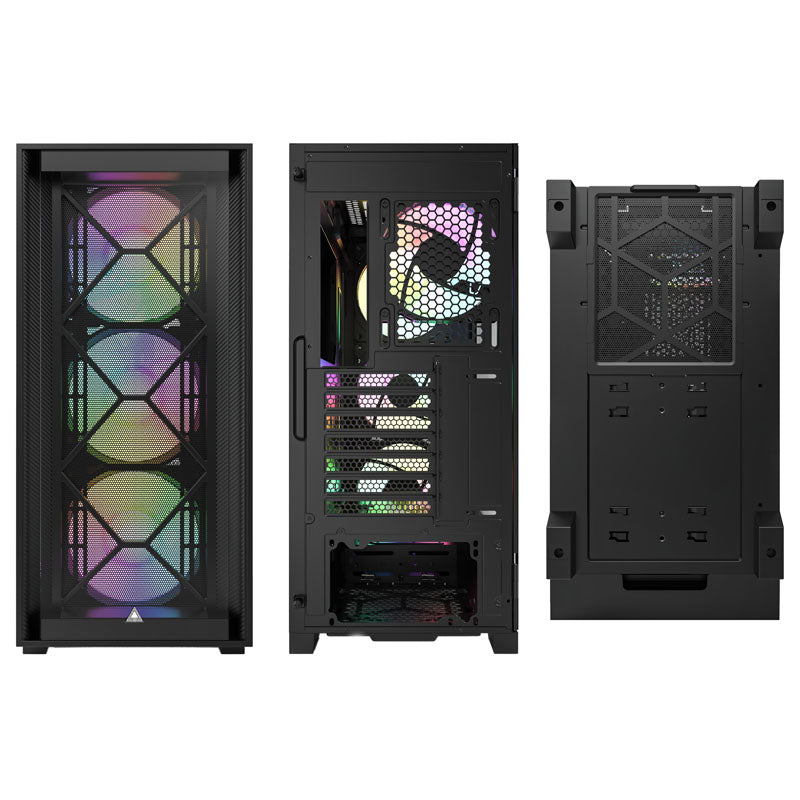 Funktionsreicher Midi-Tower von Montech, für Mini-ITX / Micro-ATX / ATX Mainboards, Radiatoren bis 360 mm möglich, Seitenteil aus Temperglas mit Scharnieren, vier ARGB-Lüfter vorinstalliert