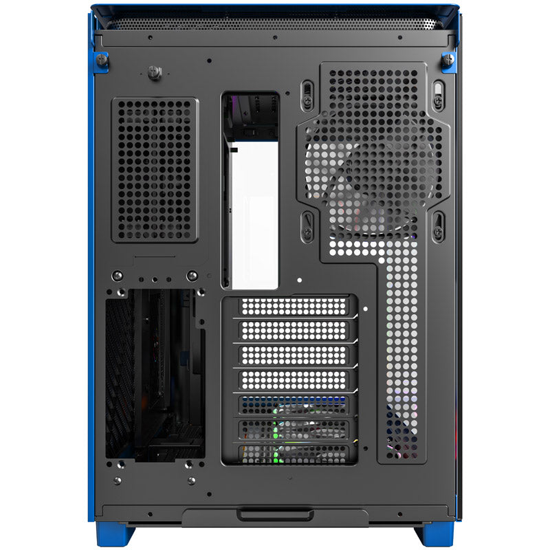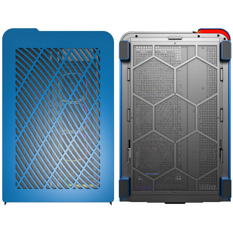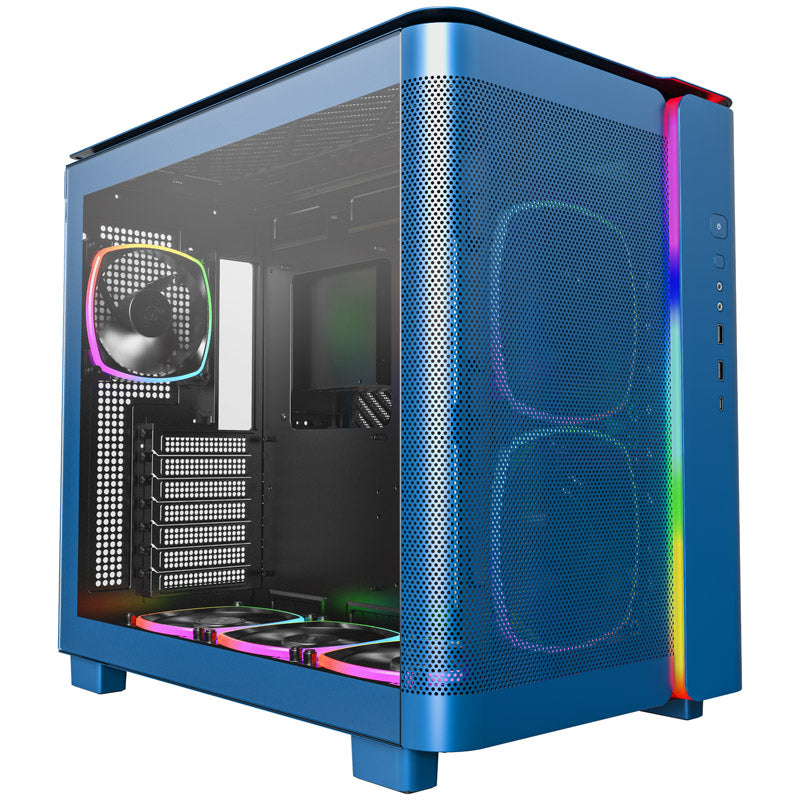 Gut ausgestatteter Midi-Tower, Vorderseite und Seitenteil aus Tempered Glass, linkes Seitenteil und Deckel mit Lüftungsschlitzen, 6x 140er-ARGB-PWM-Lüfter vorinstalliert, GPU-Länge von bis 420 mm, ARGB-Strip an der Front, bis zu zwei Netzteile möglich