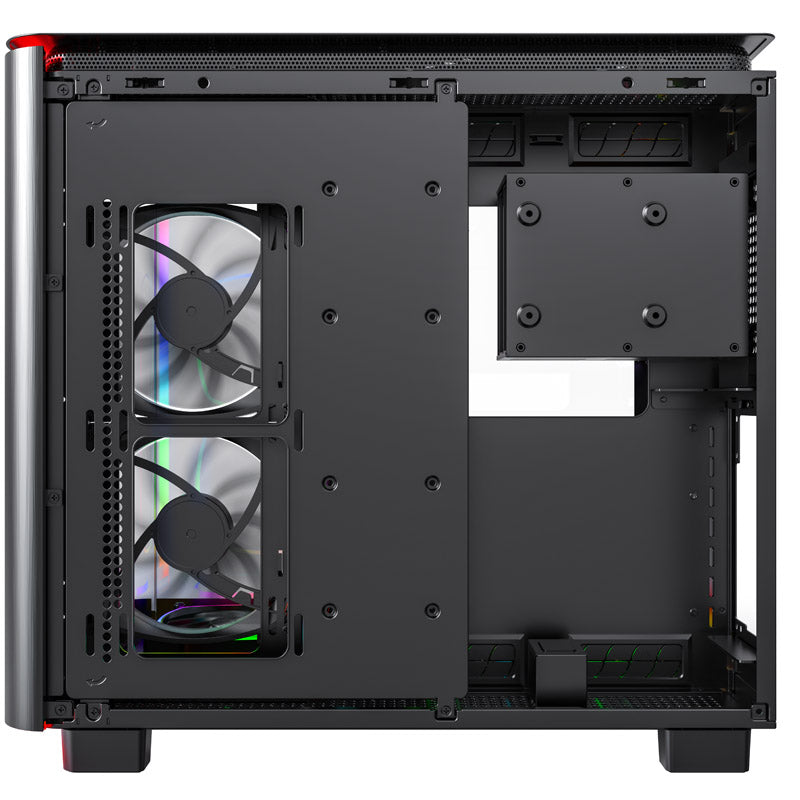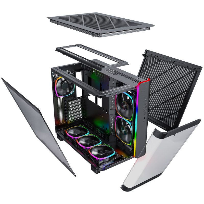 Gut ausgestatteter Midi-Tower, Vorderseite und Seitenteil aus Tempered Glass, linkes Seitenteil und Deckel mit Lüftungsschlitzen, 6x 140er-ARGB-PWM-Lüfter vorinstalliert, GPU-Länge von bis 420 mm, ARGB-Strip an der Front, bis zu zwei Netzteile möglich