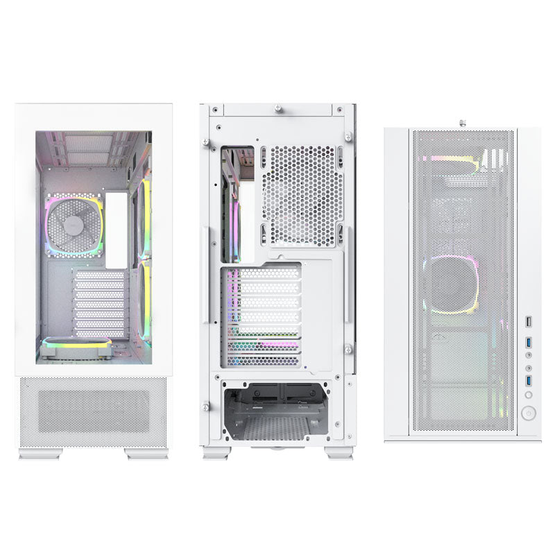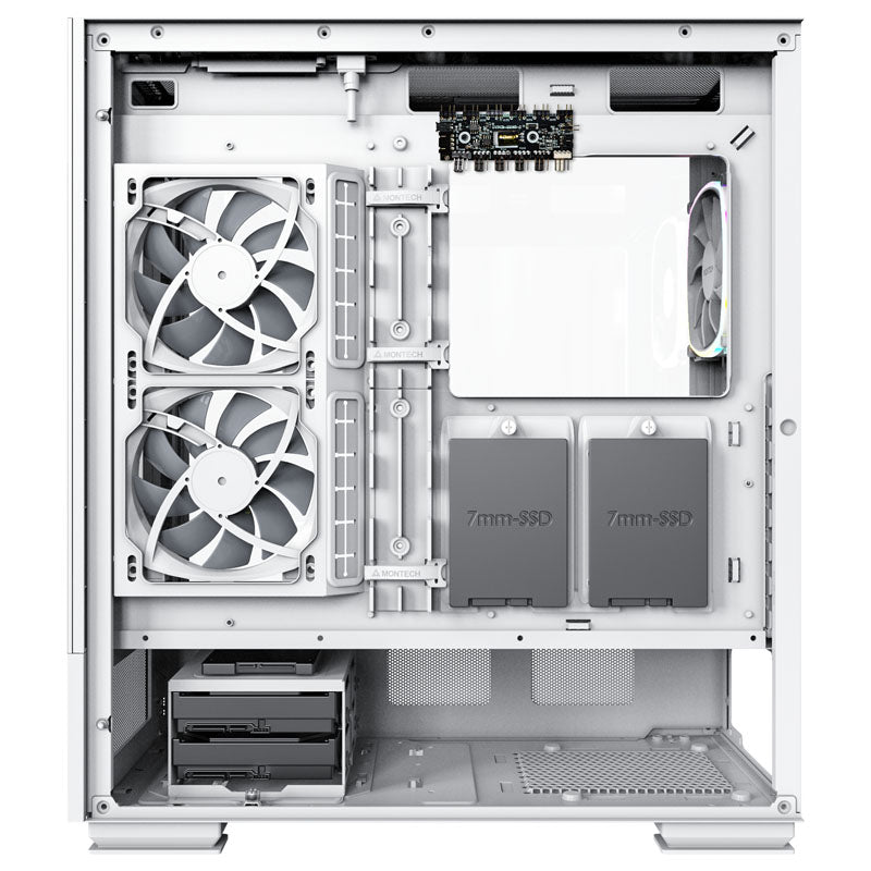 Geräumiger Midi-Tower mit gutem Airflow von Montech, für Mainboards bis ATX, Radiatoren bis 360 mm möglich, Front und Seitenteil aus Temperglas, vier 120-mm-PWM-ARGB-Lüfter vorinstalliert