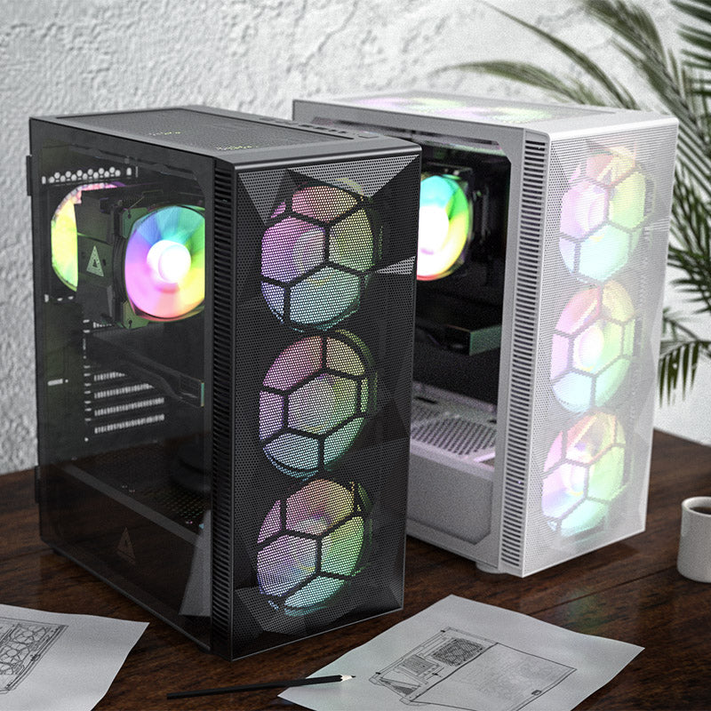 Gut ausgestatteter Midi-Tower, Vorderseite Seitenteil aus Tempered Glass, Seitenteil an Scharnieren, 3x 140er- und 3x 120er-Lüfter vorinstalliert, GPU-Länge von bis 305 mm