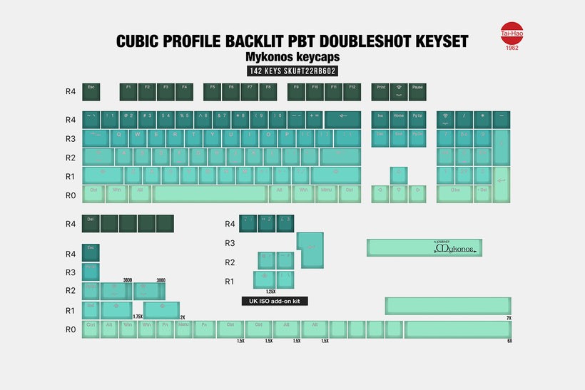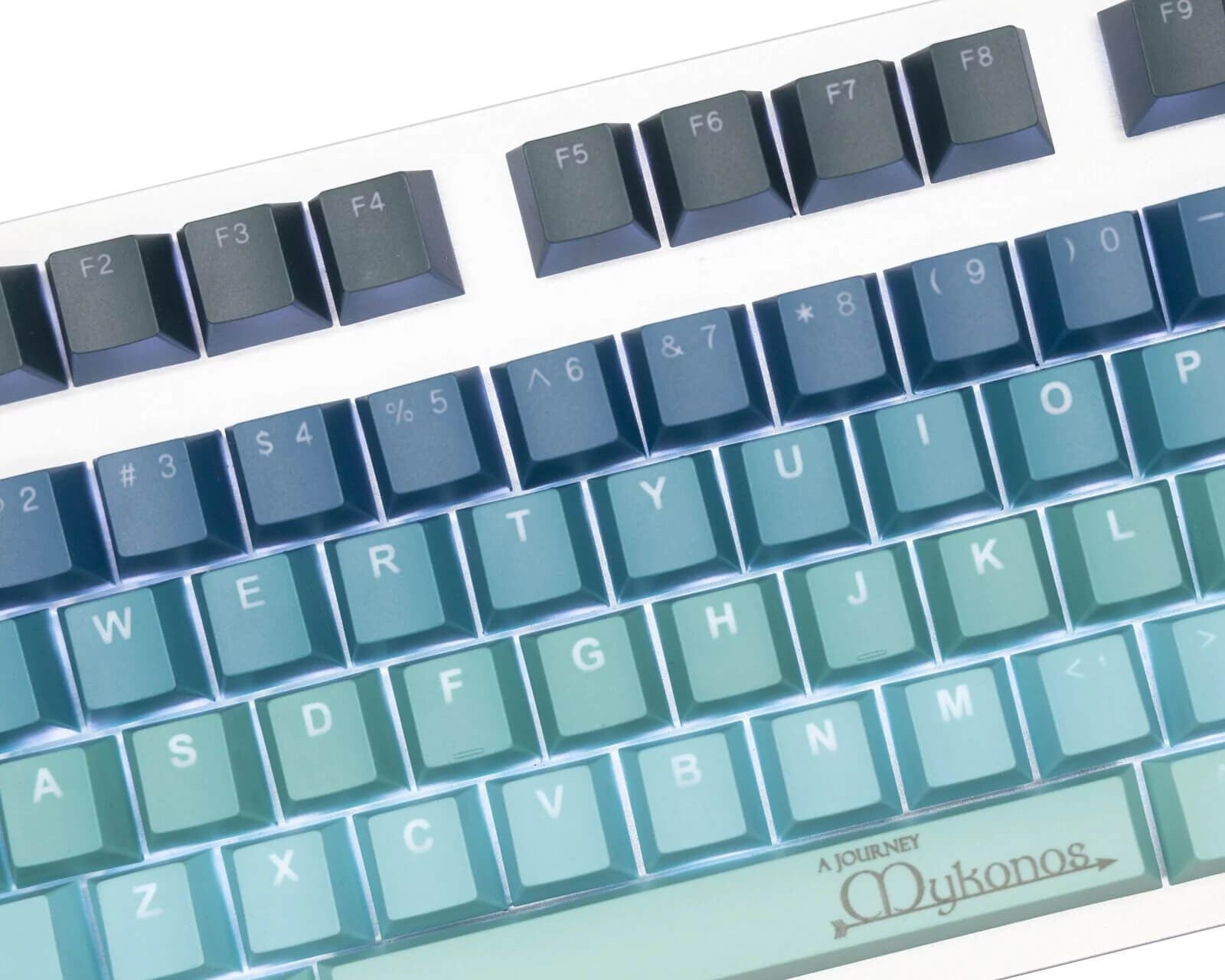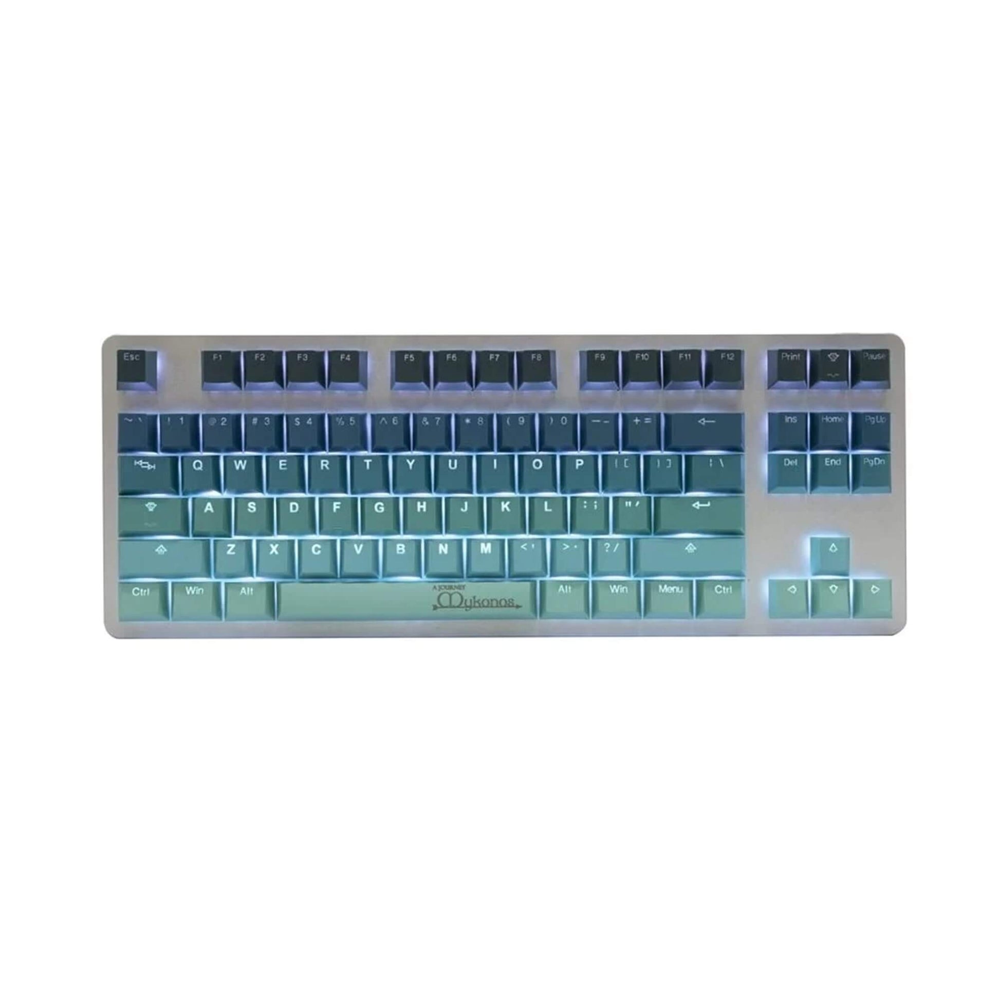Das Mykonos Keycap Set umfasst insgesamt 142 Tasten, einschließlich speziell integrierter 8 ISO-UK Ergänzungs-Tasten, wodurch es vielseitig und anpassbar für verschiedene Tastaturlayouts ist. Es ist kompatibel mit Cherry MX Schaltern und deren Klonen, und passt hervorragend auf 60%, 65%, 75%, Full-size und TKL Tastaturen.