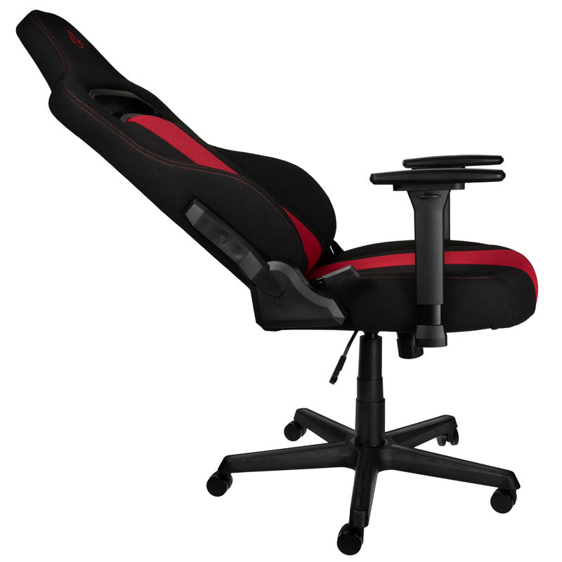 Ergonomischer Gaming-Stuhl aus Nitro Concepts' moderner E250-Serie, Stoffbezug in Schwarz und Rot, bequeme Kaltschaumpolsterung, Top-Ergonomie dank flexibler Verstellmöglichkeiten, 50-mm-Rollen für Hart- & Weichböden, bis 125 kg belastbar