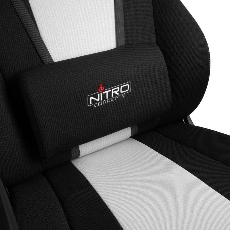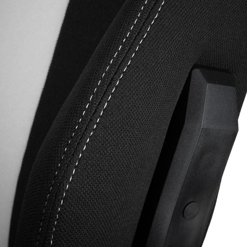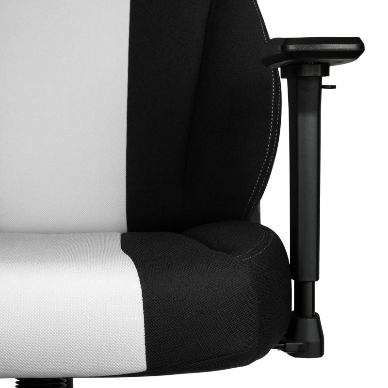 Ergonomischer Gaming-Stuhl aus Nitro Concepts' moderner E250-Serie, Stoffbezug in Schwarz und Weiß, bequeme Kaltschaumpolsterung, Top-Ergonomie dank flexibler Verstellmöglichkeiten, 50-mm-Rollen für Hart- & Weichböden, bis 125 kg belastbar