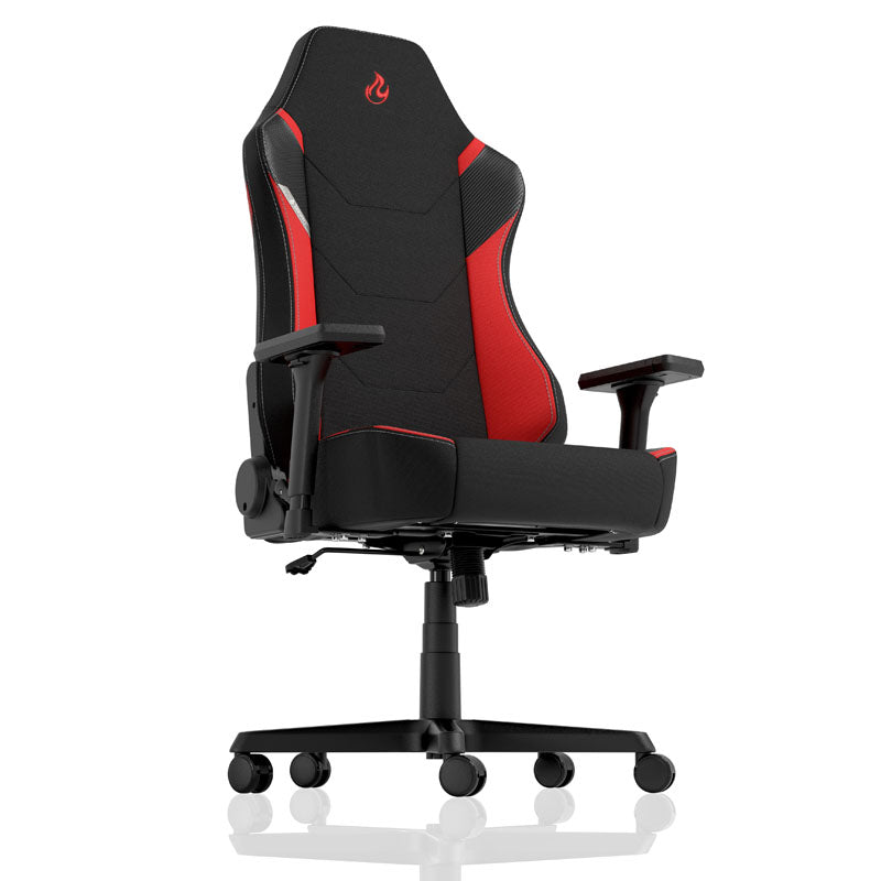 Imposanter Gaming-Stuhl aus Nitro Concepts' X1000-Serie, Stoffbezug in Inferno Red, bequeme Kaltschaumpolsterung, Top-Ergonomie dank flexibler Verstellmöglichkeiten, 60-mm-Rollen für Hart- & Weichböden, bis 135 kg belastbar