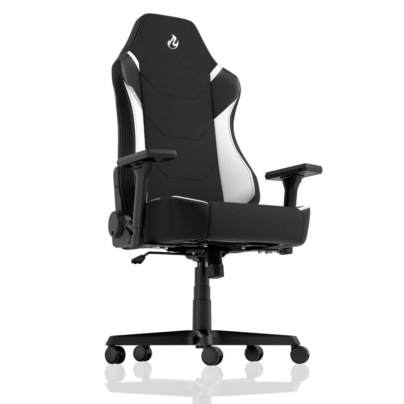 Imposanter Gaming-Stuhl aus Nitro Concepts' X1000-Serie, Stoffbezug in Radiant White, bequeme Kaltschaumpolsterung, Top-Ergonomie dank flexibler Verstellmöglichkeiten, 60-mm-Rollen für Hart- & Weichböden, bis 135 kg belastbar