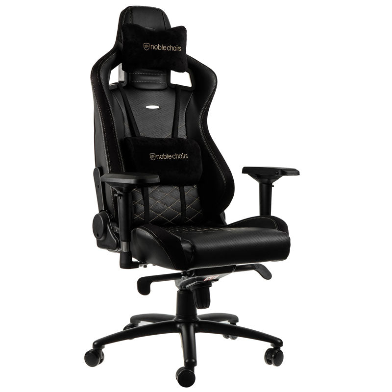 Atmungsaktiver Gaming-Sessel von noblechairs in Schwarz mit goldenen Nähten, 60-mm-Rollen, 4D-Armlehnen, Komplettpolsterung & Bezug aus 2 Arten von veganem PU-Kunstleder