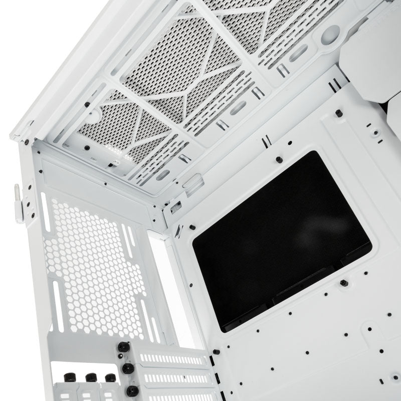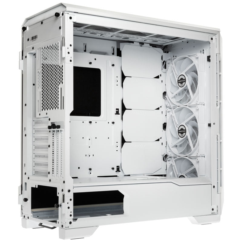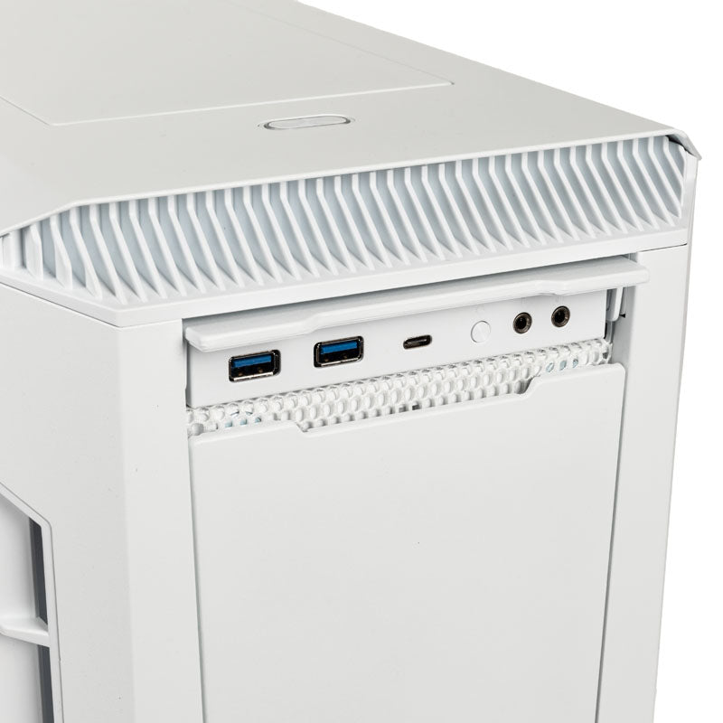 Stylisher Midi-Tower in Weiß, Seitenteil aus Tempered Glass, optimiert für Luftkühlung, mit Schalldämmung, bis zu 435 mm lange Grafikkarten, großer Wakü-Support und drei vorinstallierte Fans