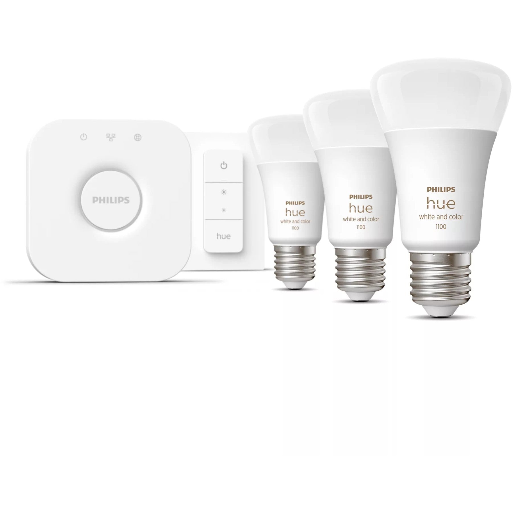 Philips Hue White and Color ambiance Starter-Set: E27 - Lampe A60 Dreierpack + Dimmschalter. Typ: Set für intelligente Beleuchtung. Schnittstelle: Bluetooth. Produktfarbe: Weiß. Unterstützte mobile Betriebssysteme: Android. iOS. Energieeffizienzklasse: F. Energieverbrauch pro 1.000 Stunden: 11 kWh. Stromverbrauch (Standby): 0.5 W. Breite: 219 mm. Tiefe: 176 mm. Höhe: 140 mm. Verpackungsart: Box. Verpackungsbreite: 21.9 mm. Verpackungstiefe: 17.6 mm