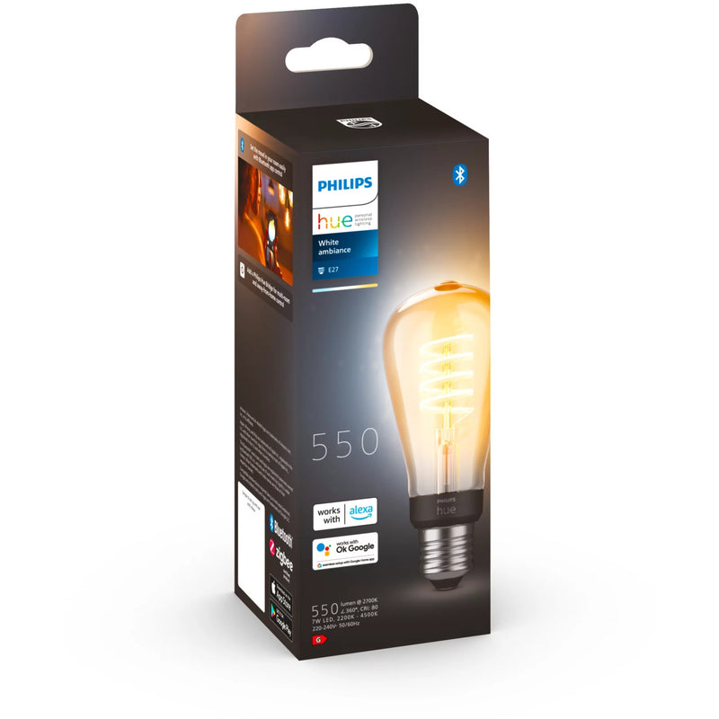 Philips E27 - Filament Edison ST64 - 550. Typ: Intelligentes Leuchtmittel. Schnittstelle: Bluetooth. Leuchtmitteltyp: LED. Energieeffizienzklasse: G. Stromverbrauch (Standby): 0.5 W. Stromverbrauch (max.): 7 W. Breite: 60 mm. Tiefe: 60 mm. Höhe: 133 mm. Verpackungsbreite: 7.2 mm. Verpackungstiefe: 7.2 mm. Verpackungshöhe: 17.6 mm. Menge pro Packung: 1 Stück(e). Anzahl der enthaltenen Hue Bulbs: 1 Glühbirne(n)