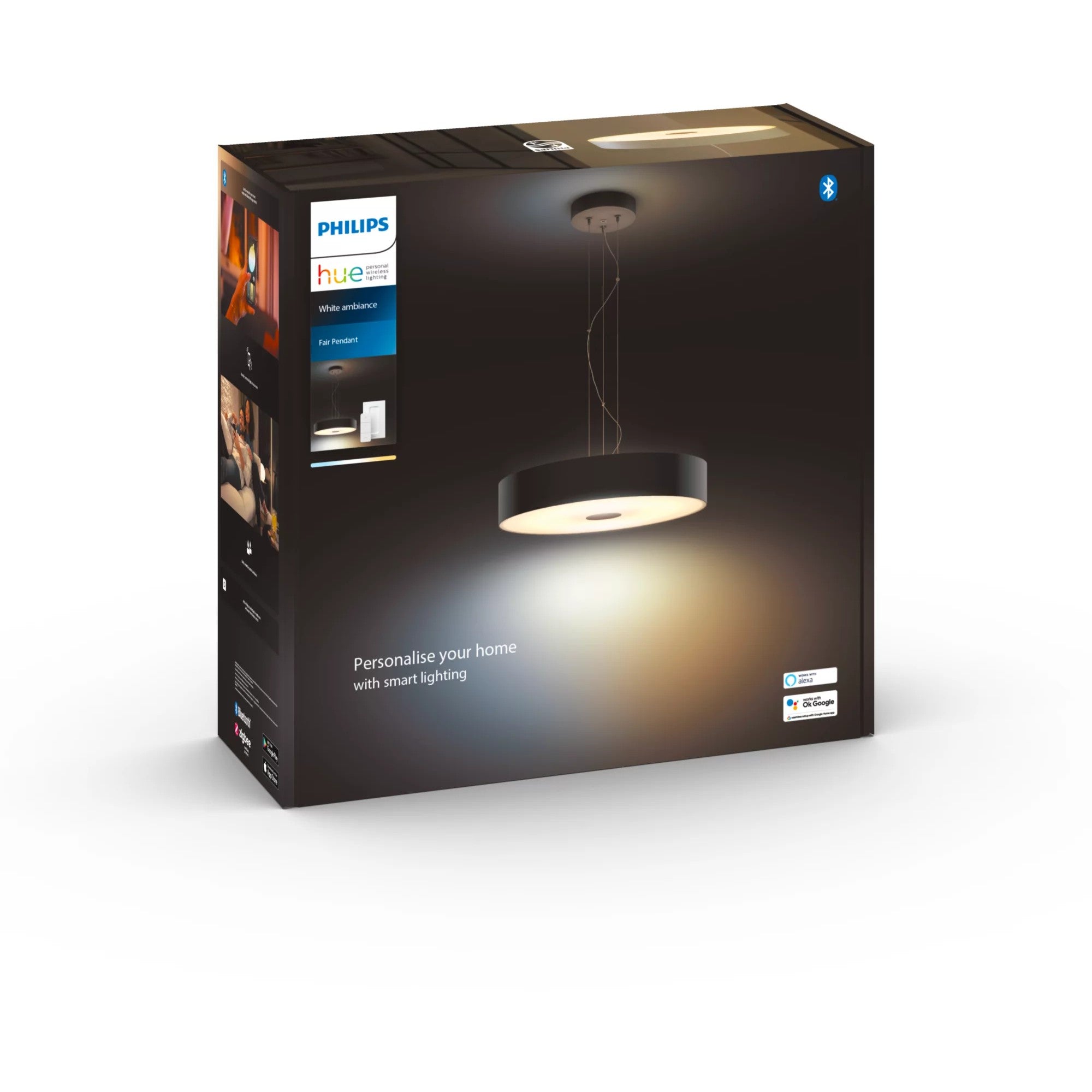 Philips Hue White ambience Fair Pendelleuchte schwarz + Dimmschalter. Typ: Intelligente Hängeleuchte. Schnittstelle: Bluetooth. Produktfarbe: Schwarz. Energieeffizienzklasse: F. Eingangsspannung: 50–60 Hz. Spannung: 24 V. Breite: 444 mm. Tiefe: 444 mm. Höhe: 80 mm. Verpackungsart: Box. Verpackungsbreite: 466 mm. Verpackungstiefe: 490 mm. Menge pro Packung: 1 Stück(e)
