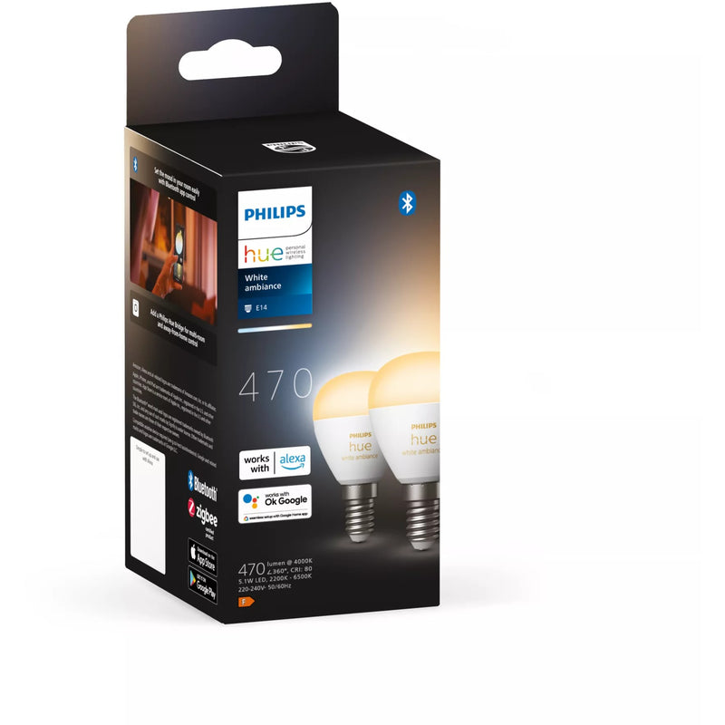 Philips Hue White ambience E14 - Smarte Lampe Tropfenform Doppelpack - 470. Typ: Intelligentes Leuchtmittel. Schnittstelle: Bluetooth. Produktfarbe: Weiß. Energieeffizienzklasse: F. Stromverbrauch (Standby): 0.5 W. Stromverbrauch (max.): 5.1 W. Breite: 45 mm. Tiefe: 45 mm. Höhe: 77 mm. Verpackungsbreite: 72 mm. Verpackungstiefe: 86 mm. Verpackungshöhe: 174 mm. Menge pro Packung: 2 Stück(e). Anzahl der enthaltenen Hue Bulbs: 2 Glühbirne(n)