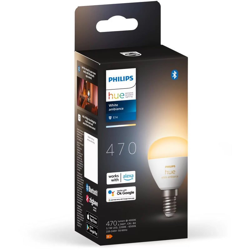 Philips Hue White ambience E14 - Smarte Lampe Tropfenform - 470. Typ: Intelligentes Leuchtmittel. Schnittstelle: Bluetooth. Produktfarbe: Weiß. Energieeffizienzklasse: F. Energieverbrauch pro 1.000 Stunden: 5 kWh. Energieeffizienzskala: A bis G. Breite: 45 mm. Tiefe: 45 mm. Höhe: 77 mm. Verpackungsbreite: 72 mm. Verpackungstiefe: 55 mm. Verpackungshöhe: 174 mm. Menge pro Packung: 1 Stück(e). Anzahl der enthaltenen Hue Bulbs: 1 Glühbirne(n)