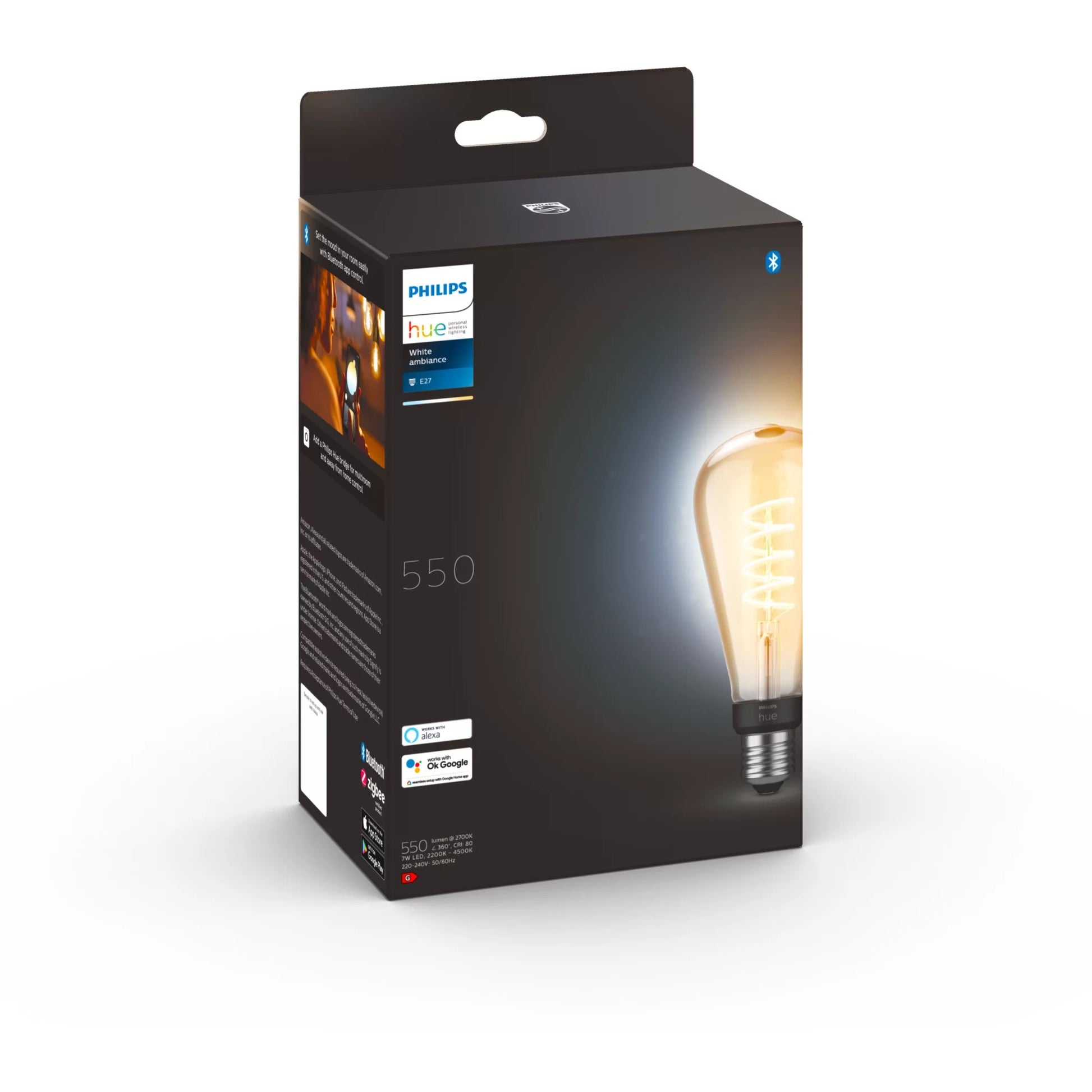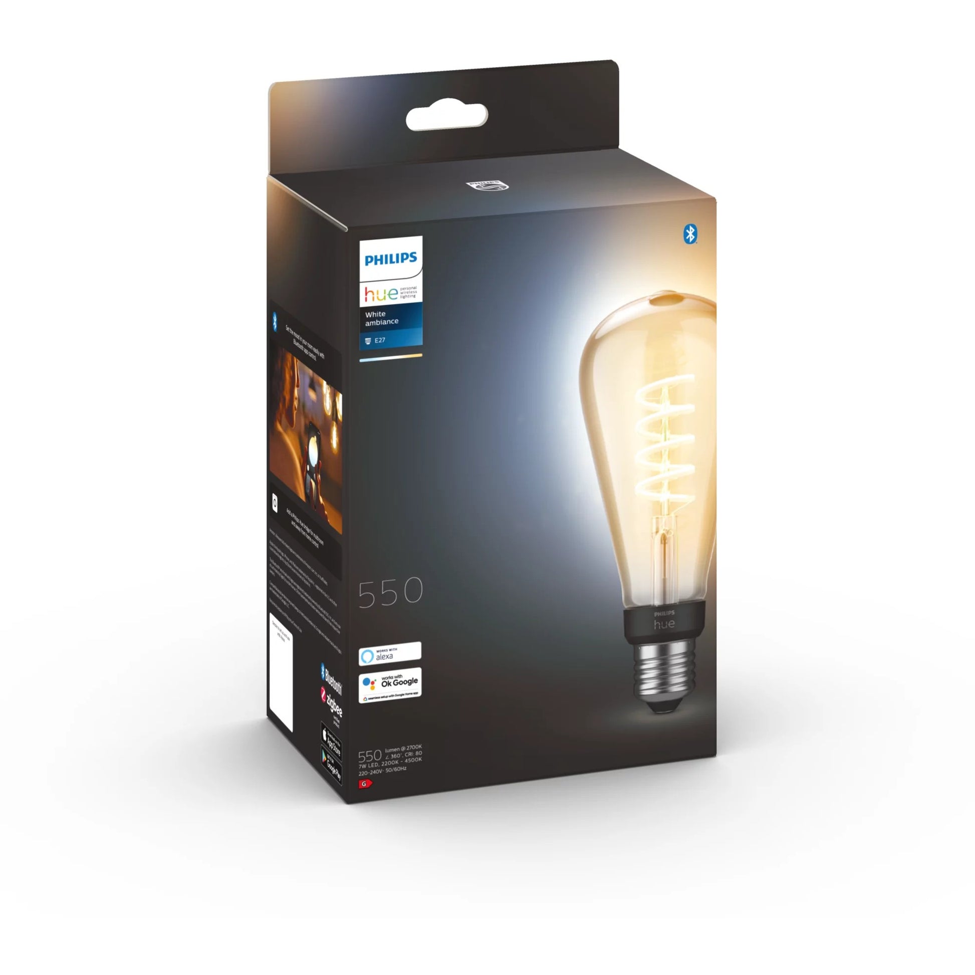 Philips E27 - Filament Giant Edison ST72 - 550. Typ: Intelligentes Leuchtmittel. Schnittstelle: Bluetooth. Leuchtmitteltyp: LED. Energieeffizienzklasse: G. Stromverbrauch (Standby): 0.5 W. Stromverbrauch (max.): 7 W. Breite: 72 mm. Tiefe: 72 mm. Höhe: 164 mm. Verpackungsbreite: 14.6 mm. Verpackungstiefe: 10 mm. Verpackungshöhe: 20.9 mm. Menge pro Packung: 1 Stück(e). Anzahl der enthaltenen Hue Bulbs: 1 Glühbirne(n)
